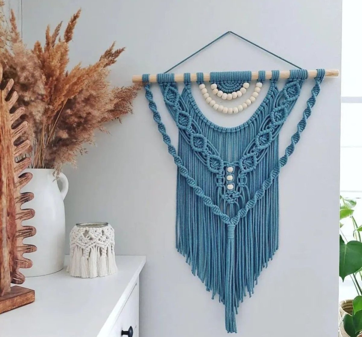 A mural with the art of trendy macramé, using imported cordon thread, carefully crafted to create a distinctive piece, 50 cm wide. It can be executed in colors of your choice to suit your home.