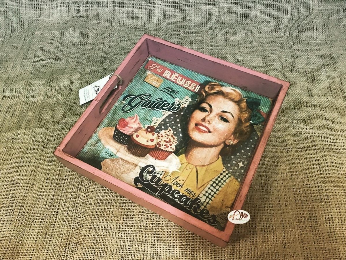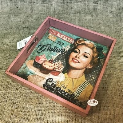 A retro-style wooden tray characterized by its classic and elegant design, complemented by a light pink color that gives it a soft and feminine touch. It can be used for serving or as a decorative item.