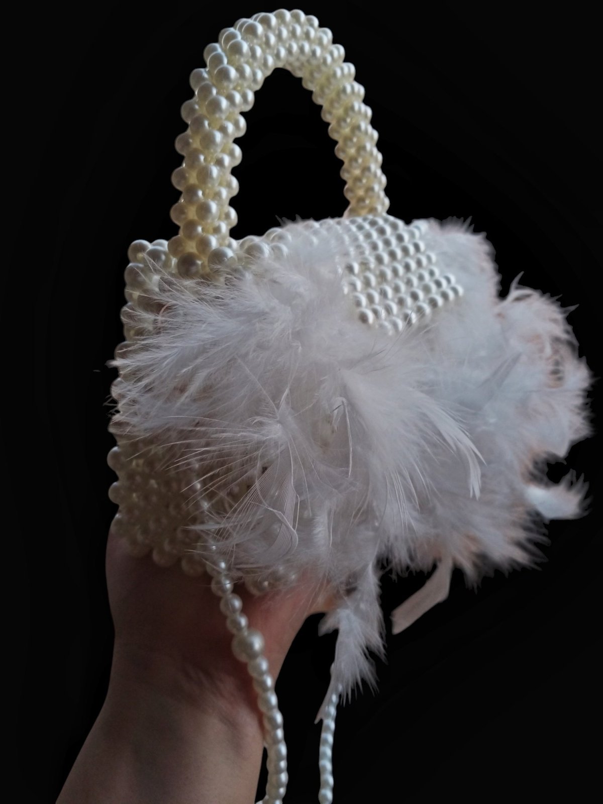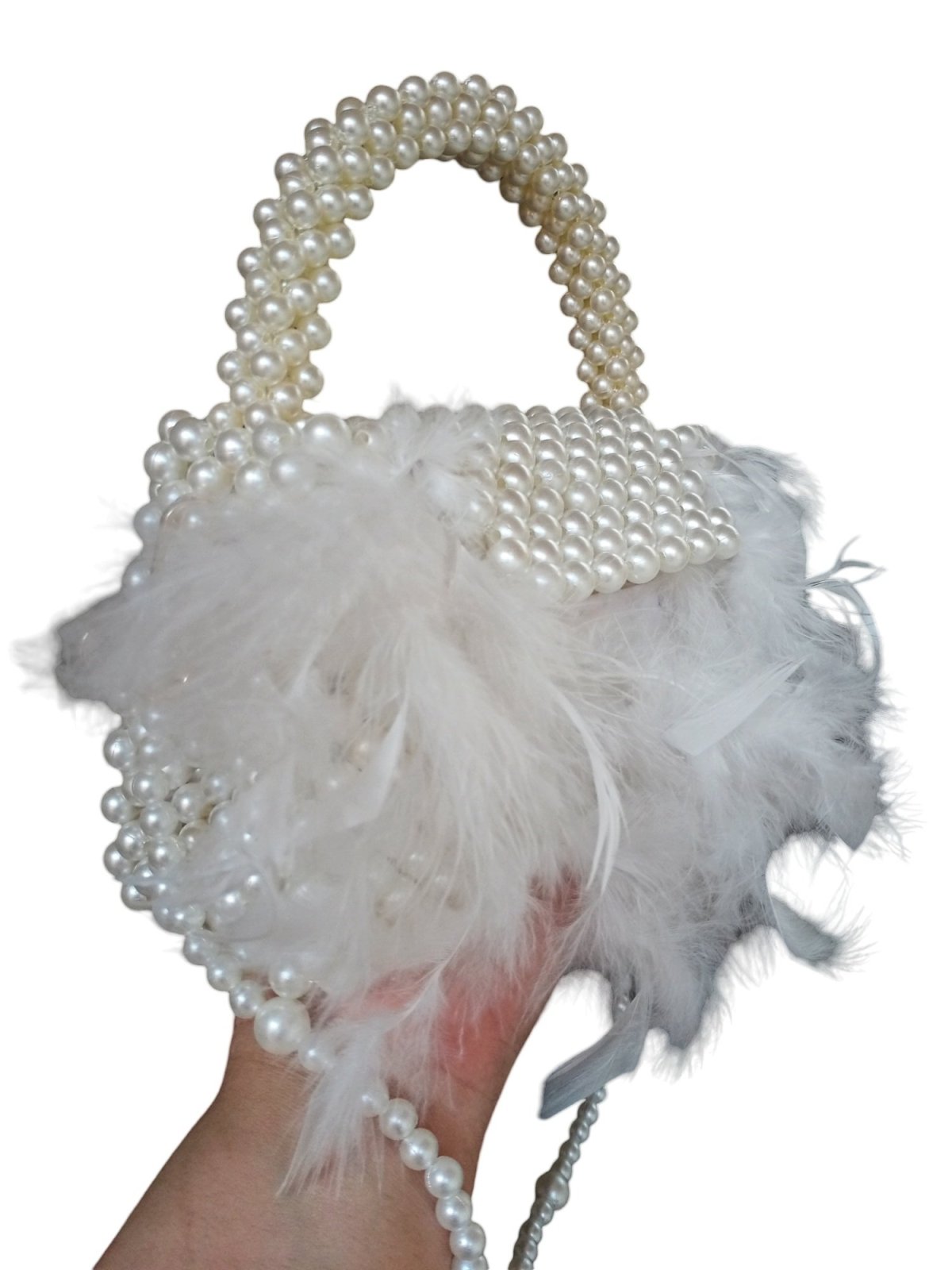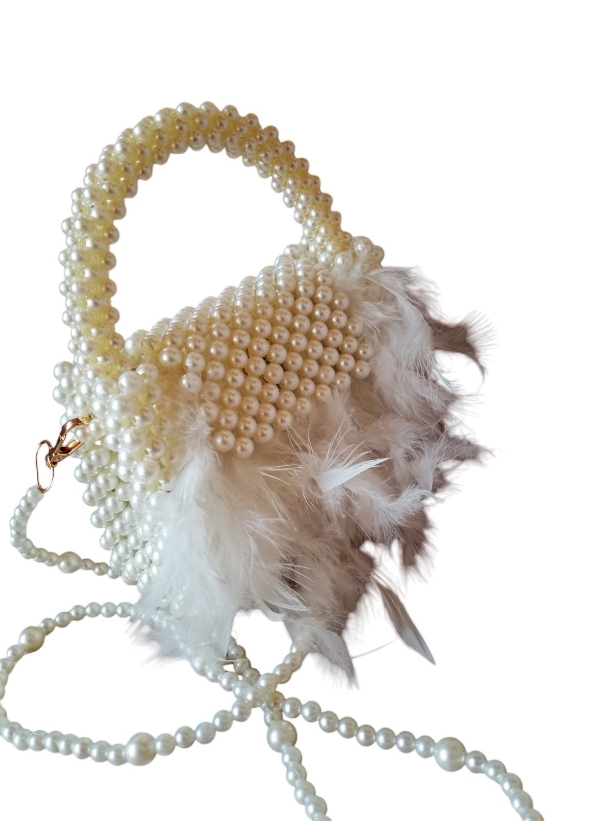 Women's pearl bag for evening wear, decorated with feathers and has a crossbody bag, size 20 x 15
