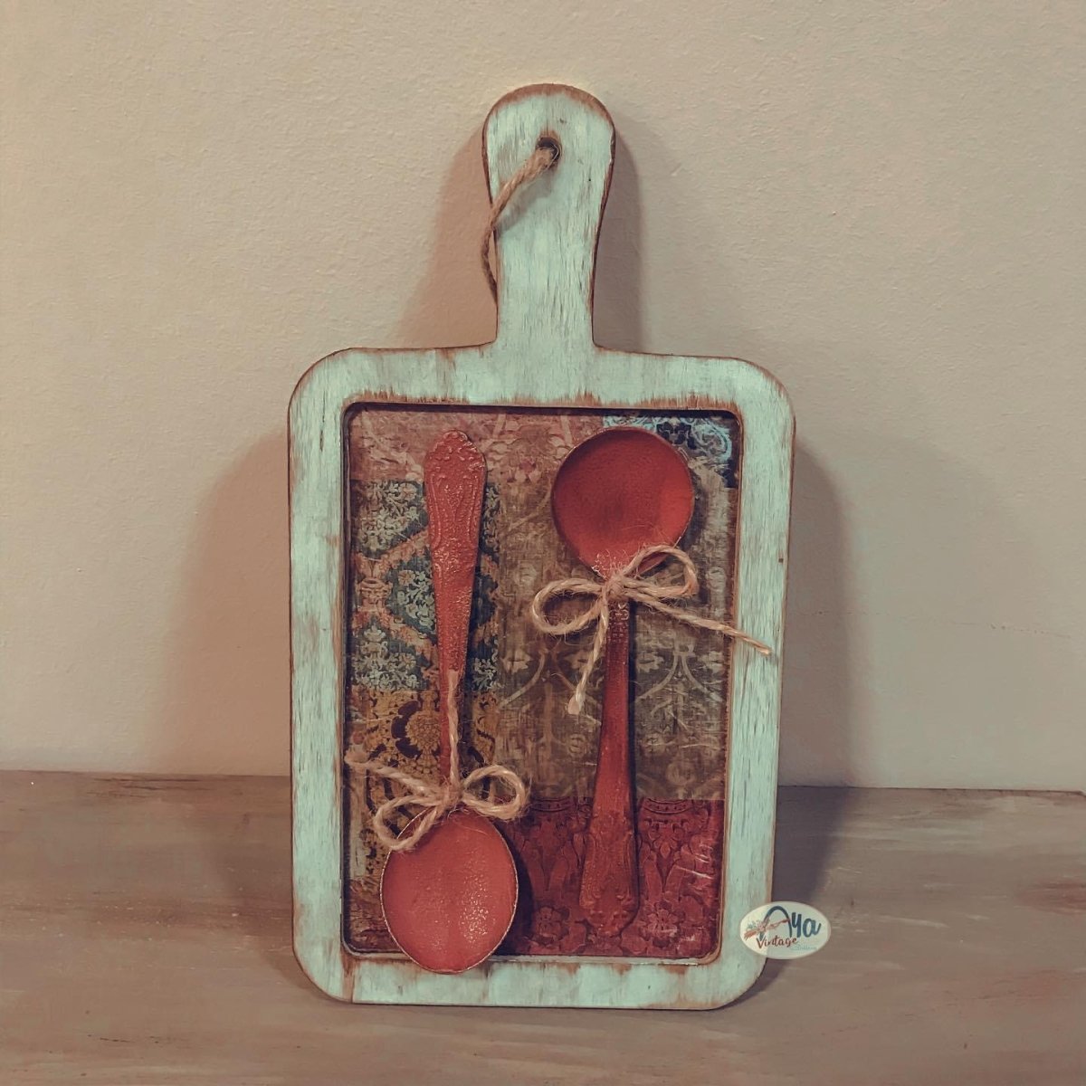 A distinctive wooden plaque with a decorative vintage style, featuring two metal spoons mounted on it. It can be placed in the kitchen or dining room decor, adding simplicity that enhances beauty and elegance.