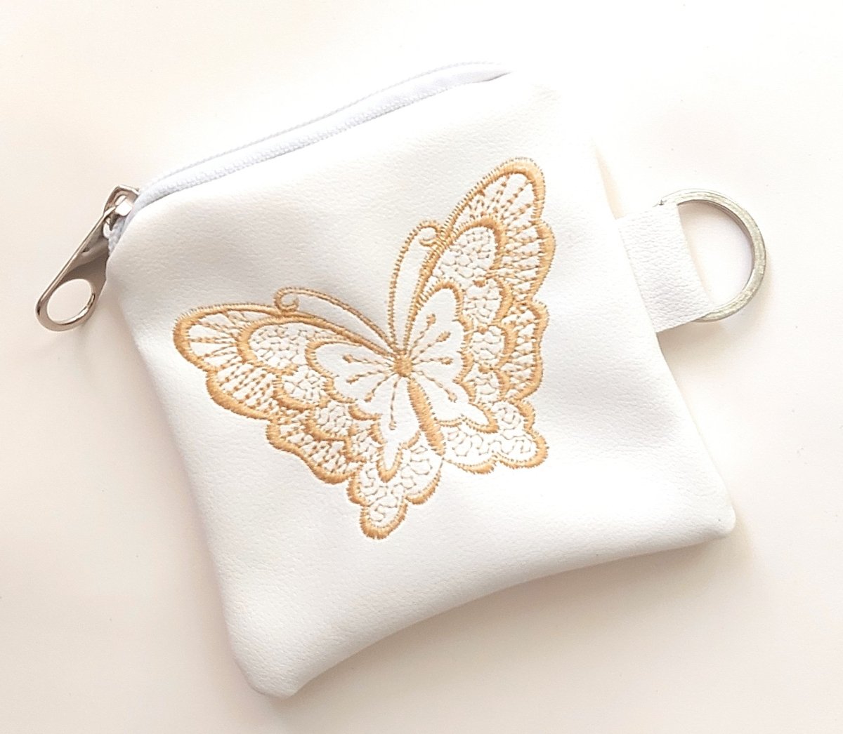 Faux leather machine embroidery key chain coin purse white butterfly