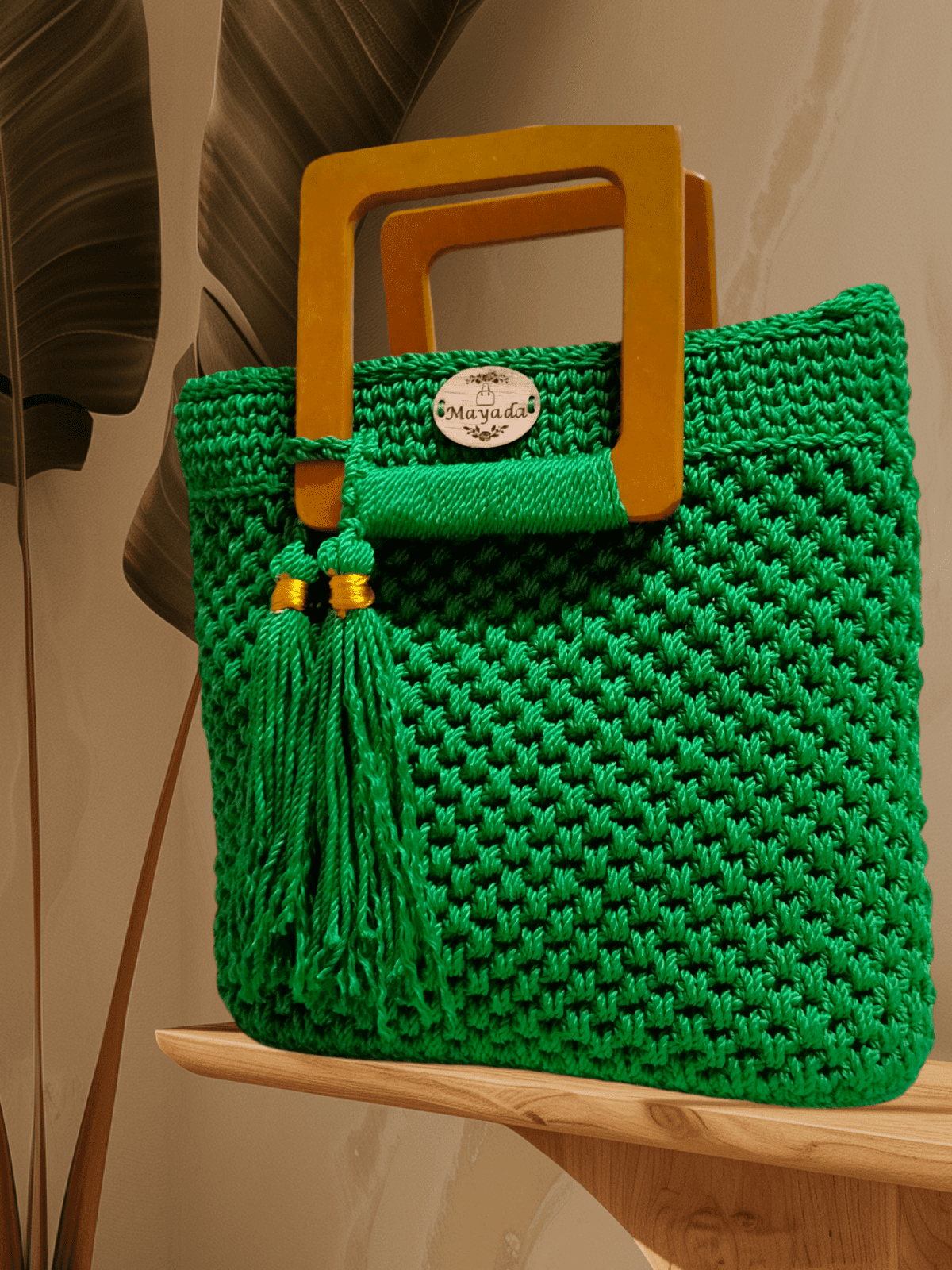 Trendy crochet bag with Egyptian macrame thread and wooden handle, one of the most elegant and valuable materials used