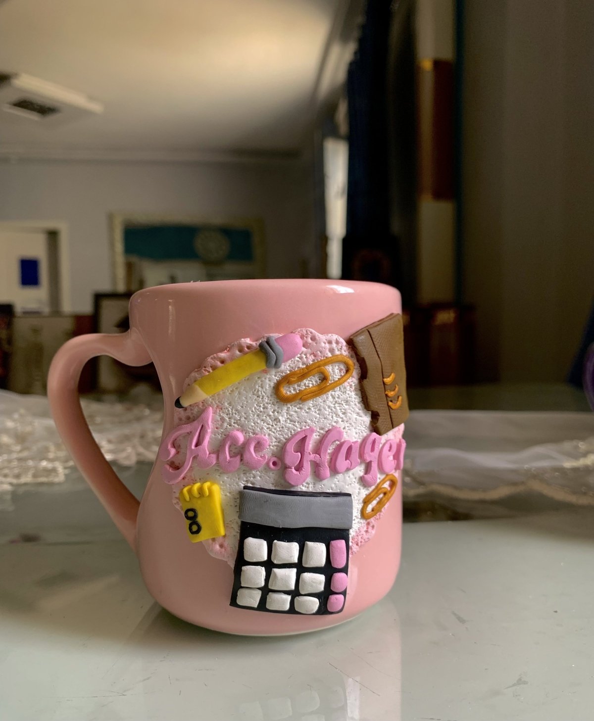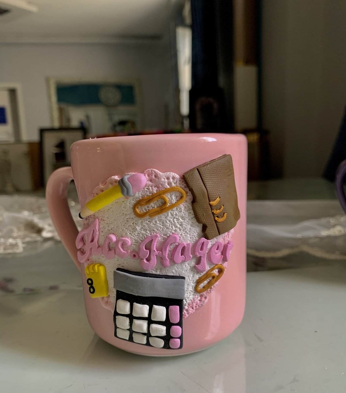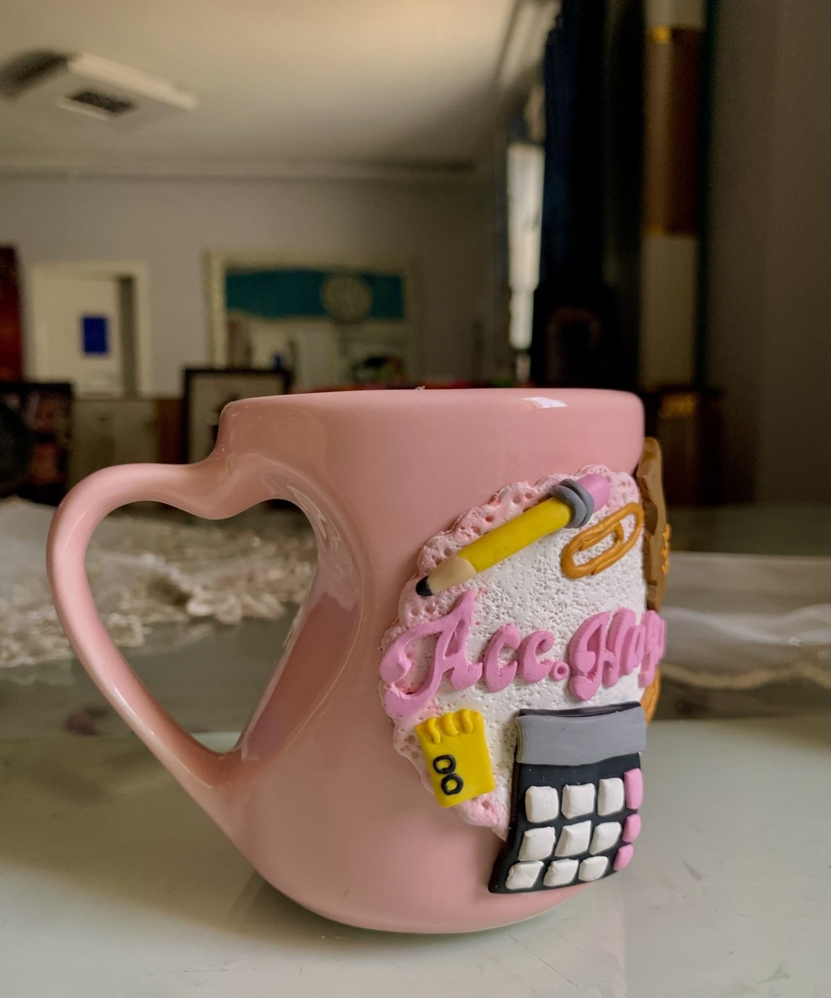 Porcelain cup with shapes made of his own clay, pink in color, mug size 330 ml, not to be used in the oven or microwave
