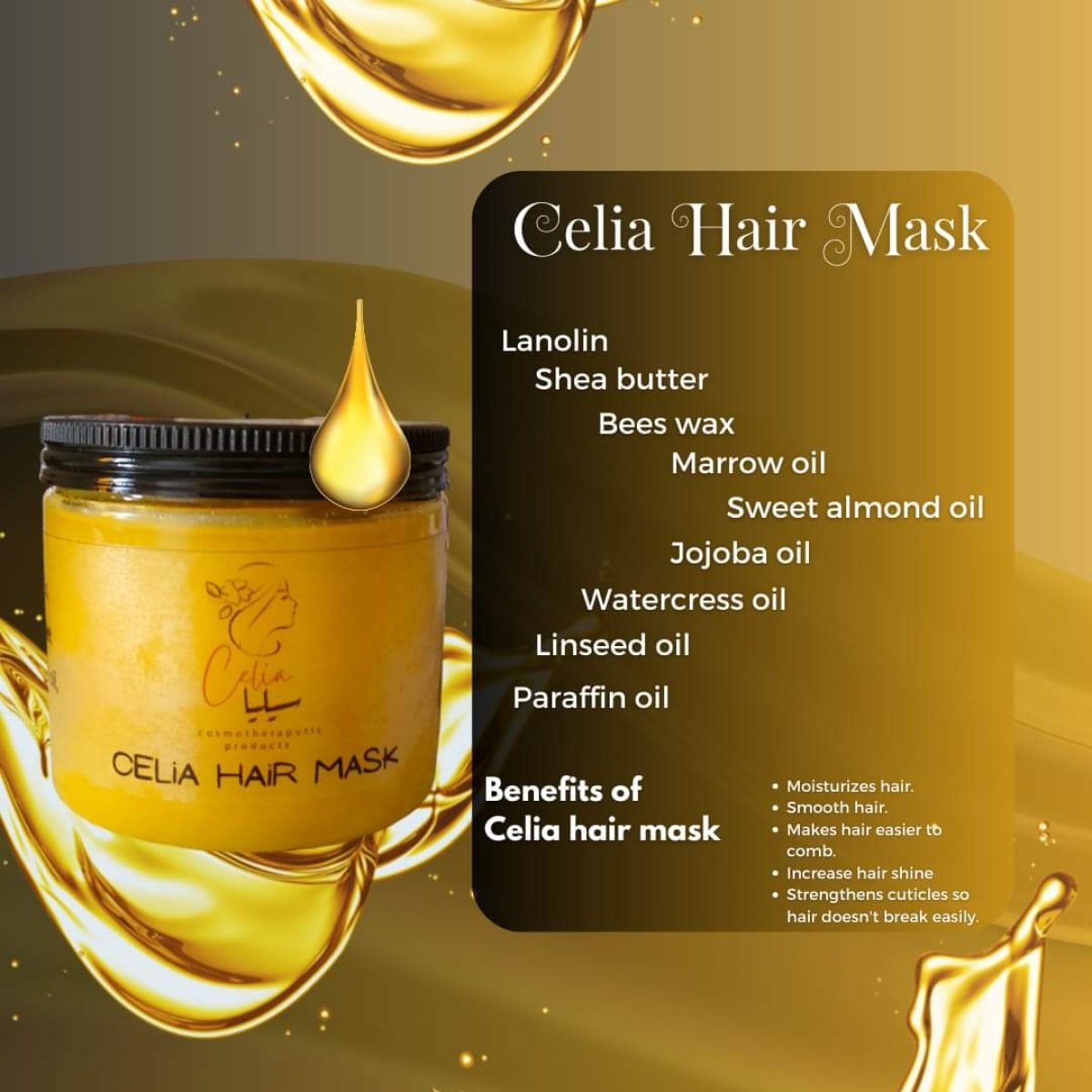 Celia Hair Mask is rich in natural shea butter, in addition to lanolin, natural beeswax, and nourishing moisturizing oils: jojoba oil, sweet almond, linseed, watercress, and nourishing vitamin E. It deeply moisturizes the hair and repairs damage Size 180 g How to use: Apply on hair for 3 hours, then wash with shampoo