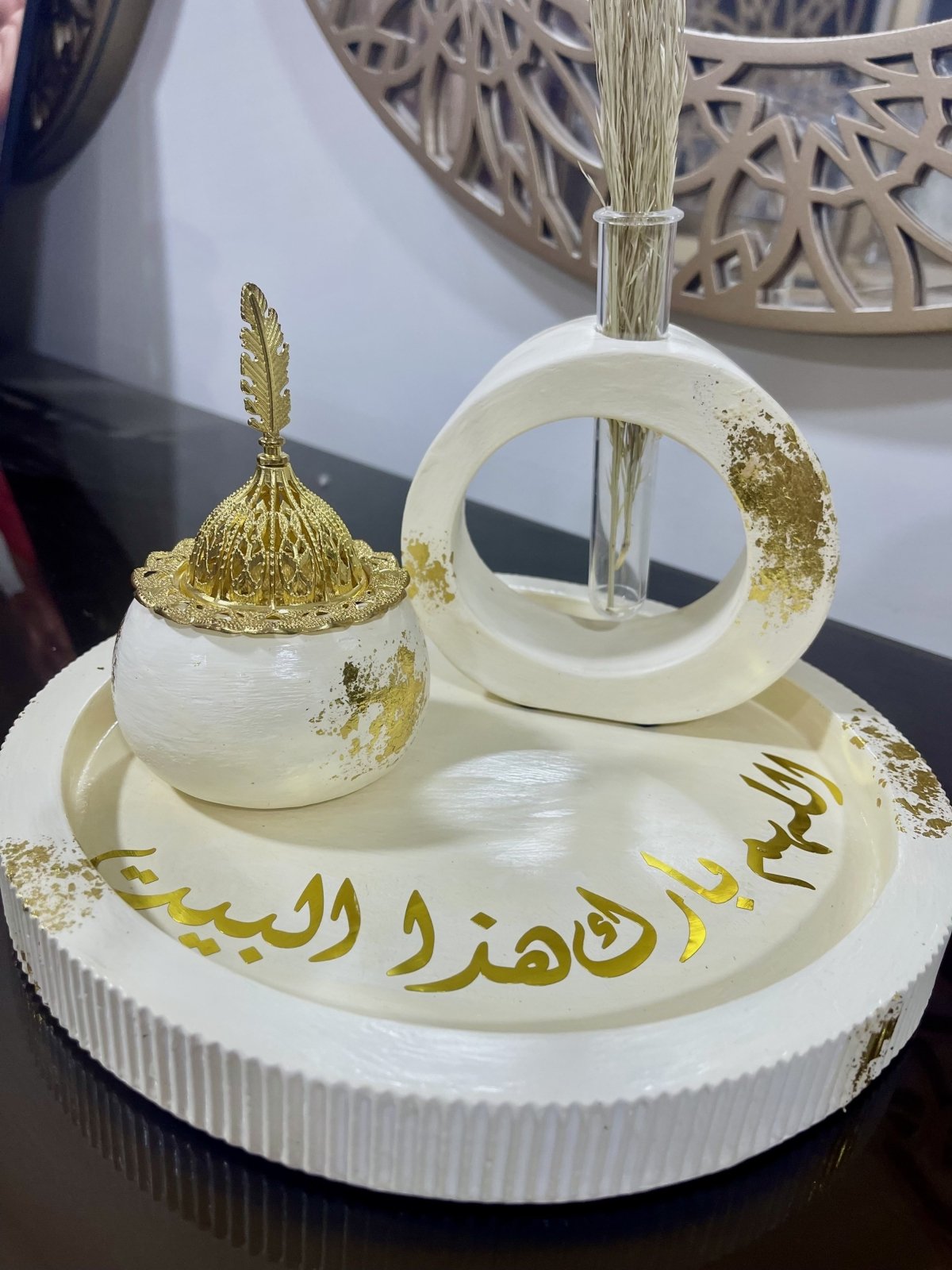 A 26-inch tray decorated with gold leaf and written on it: “Oh God, bless this house,” and an incense burner with a gold cover and a trendy vase.