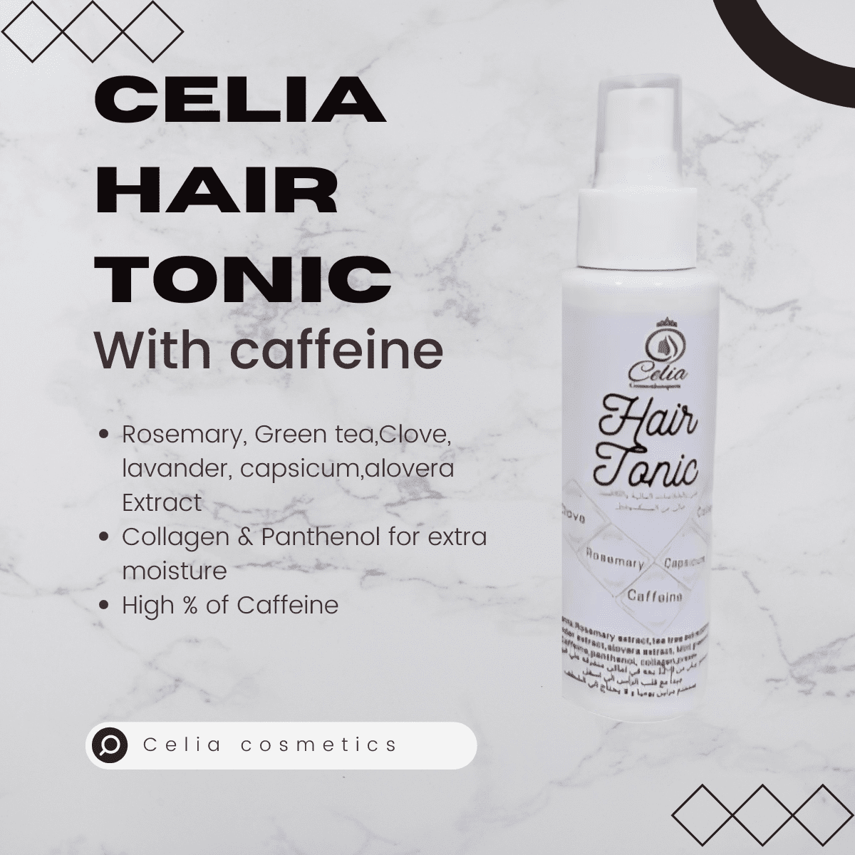 Celia hair tonic rich in caffeine, which stimulates blood flow to the hair follicles and limits hair loss, and at the same time helps hair grow again, in addition to other natural extracts such as rosemary, cloves, green tea, mint, chili pepper, and lavender in addition. To collagen and panthenol to moisturize the hair and keep the hair from drying out Size: 120 ml How to use: Use twice daily on the scalp with massage