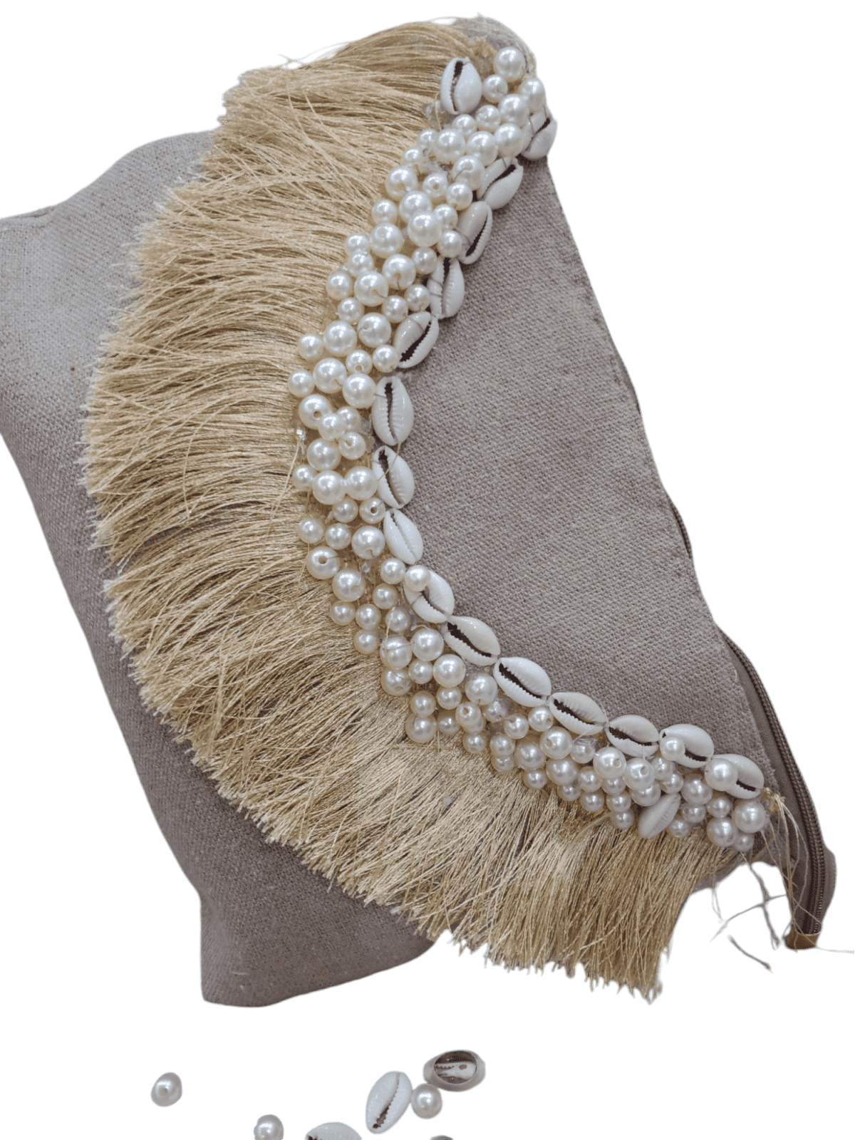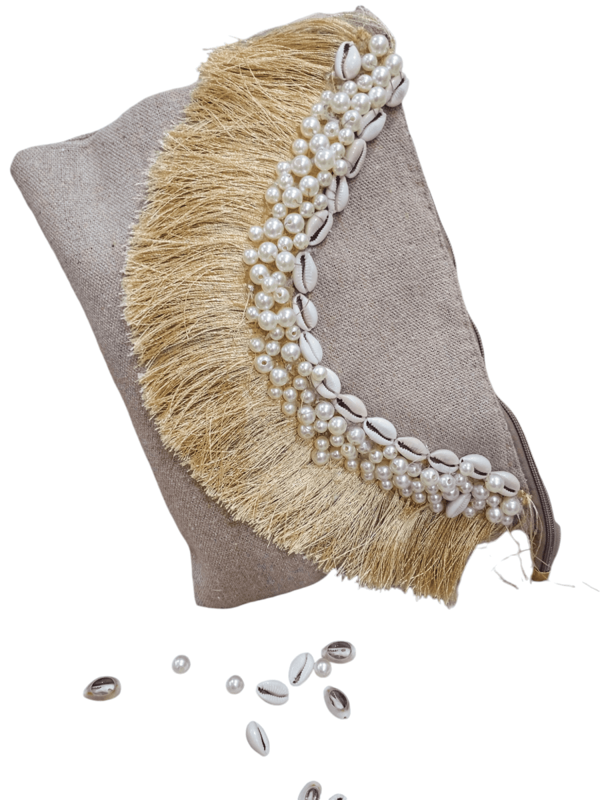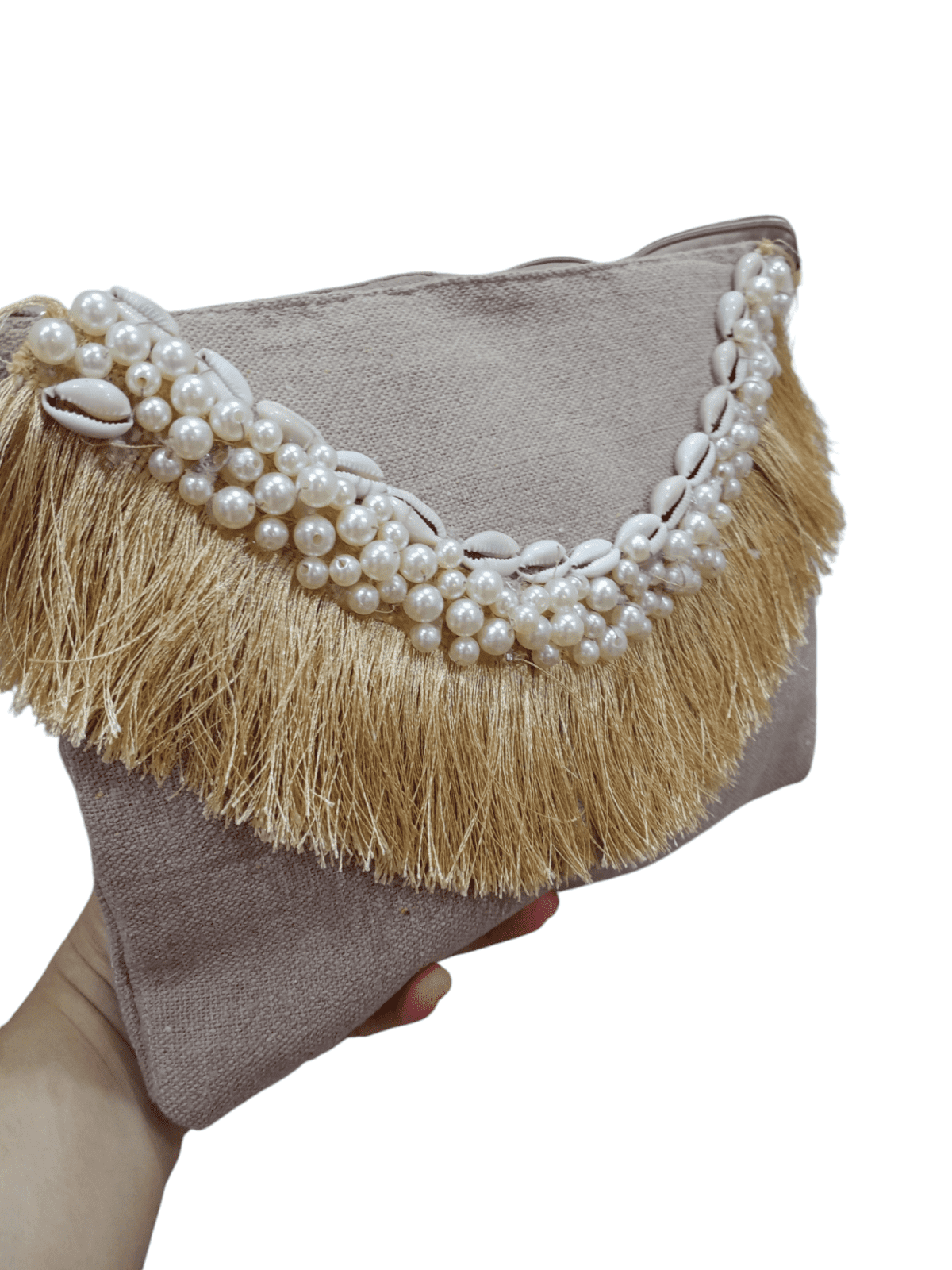 كلاتش نسائي من قماش الكتان مقوى من الداخل مع بطانة من الساتان وسحاب خارجي ومزين باللؤلؤ والأصداف الطبيعية ومخيط يدويا في الكلاتش مقاس 22/30