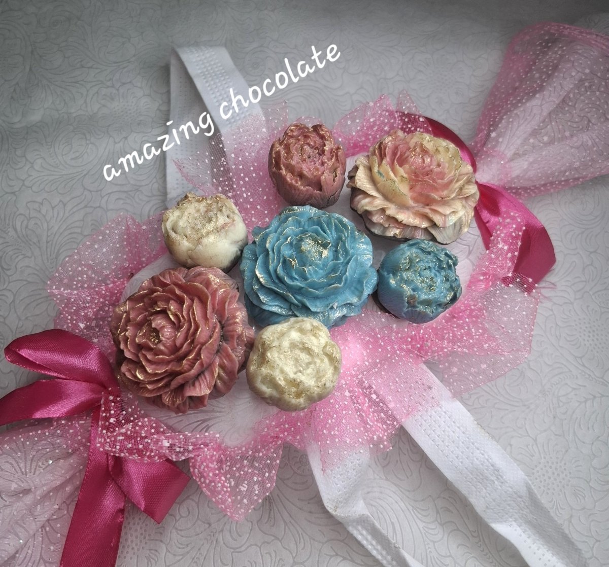 A bouquet of handmade roses in a new and distinctive shape. Each rose has a different filling from the delicious amazing chocolate fillings.