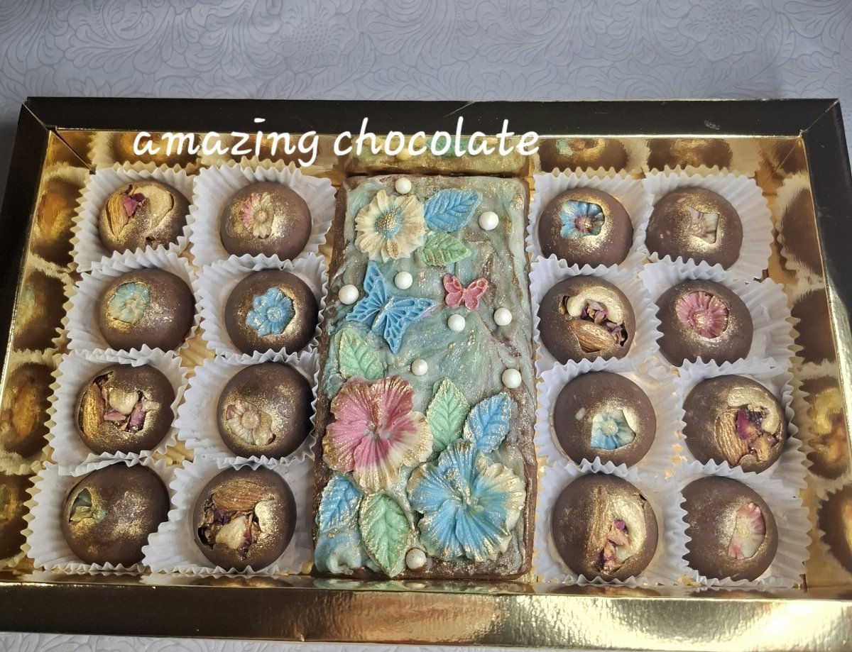 A distinctive gift box with a distinctive design consisting of 20 pieces of chocolate bonbons with nuts and distinctive fillings, and a large chocolate bar filled with pistachio kunafa.