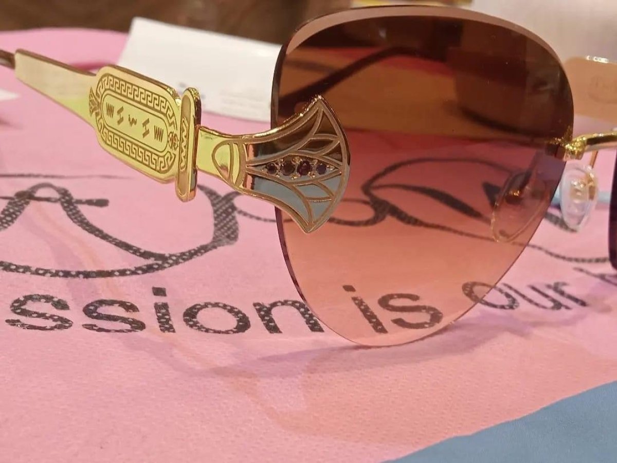 Sunglasses inspired by the Pharaonic lotus flower, mixed with brown zircon stones, in addition to temples of a Pharaonic cartouche with the customer's name