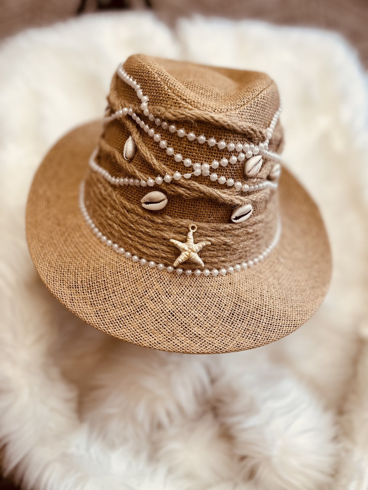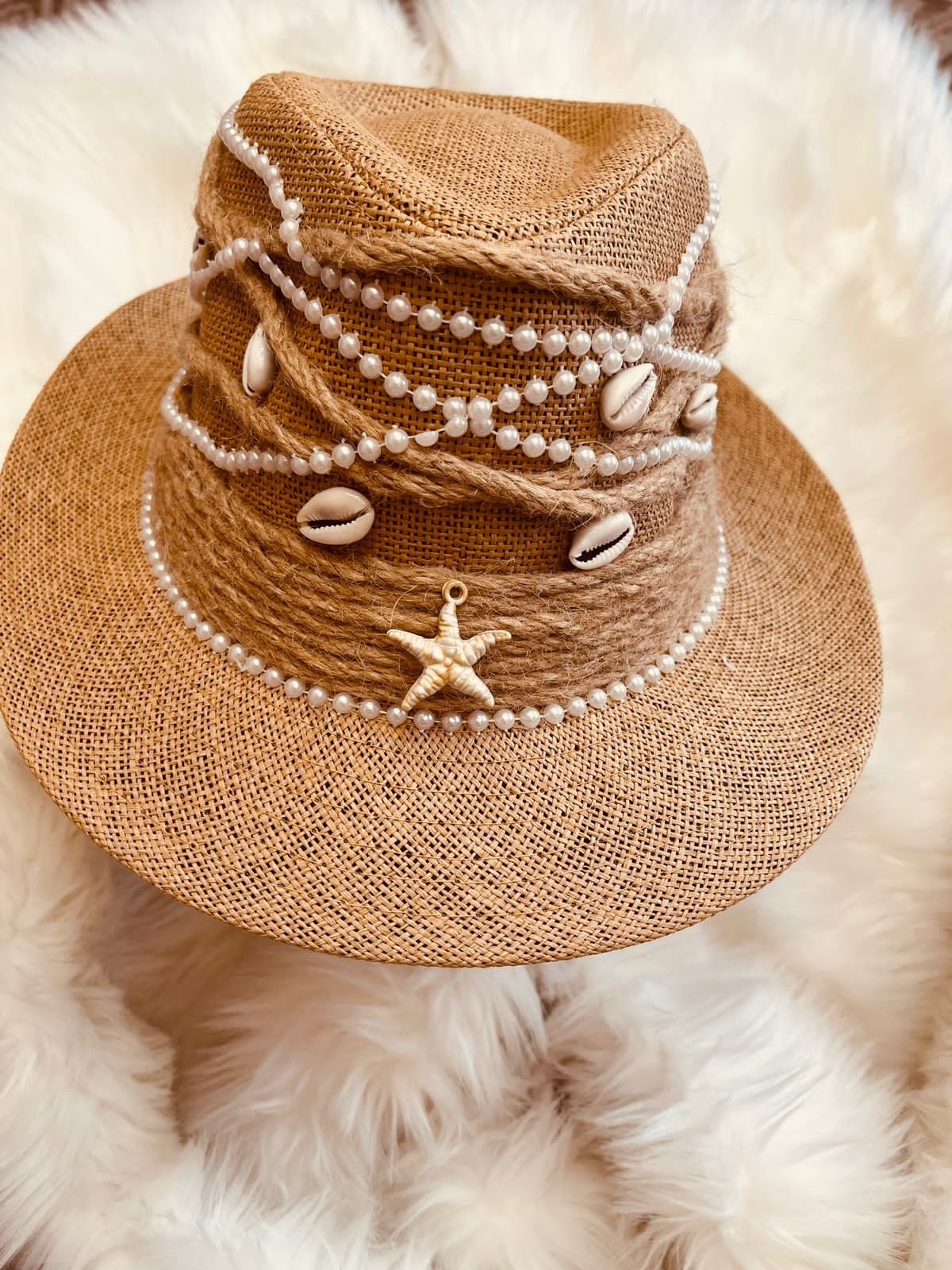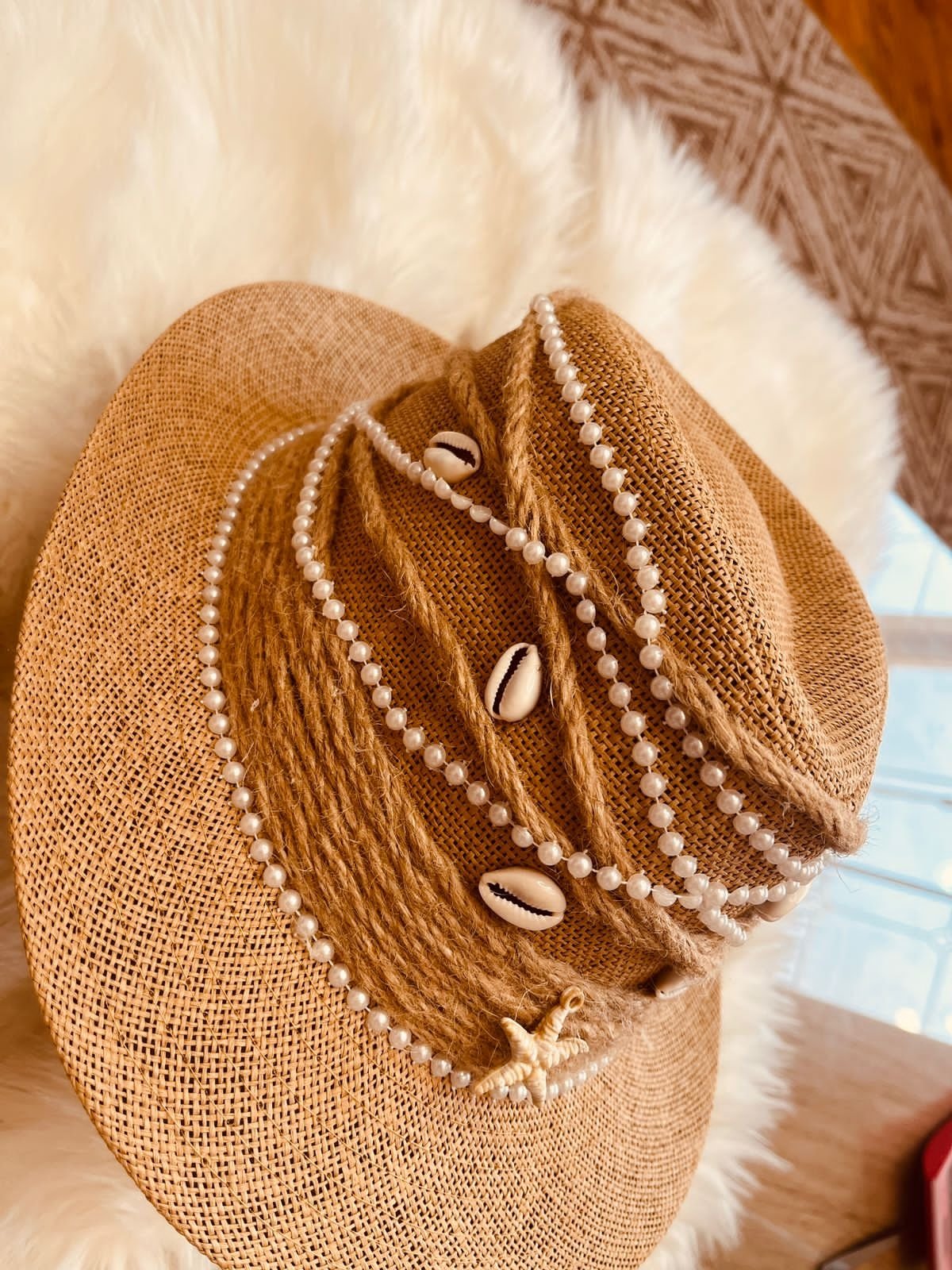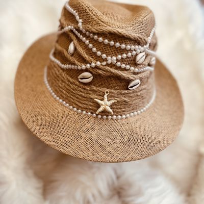 Hat with an attractive and distinctive design. The hat is decorated with strings of small pearls and decorative ropes wrapped around it, in addition to seashells that elegantly adorn it. On the front of the hat, there is a starfish embellishment that adds a great nautical touch. The design combines natural elements with simple elegance, making it perfect for summer occasions and beach outings. The natural materials used to make the hat ensure its comfort and natural beauty.
