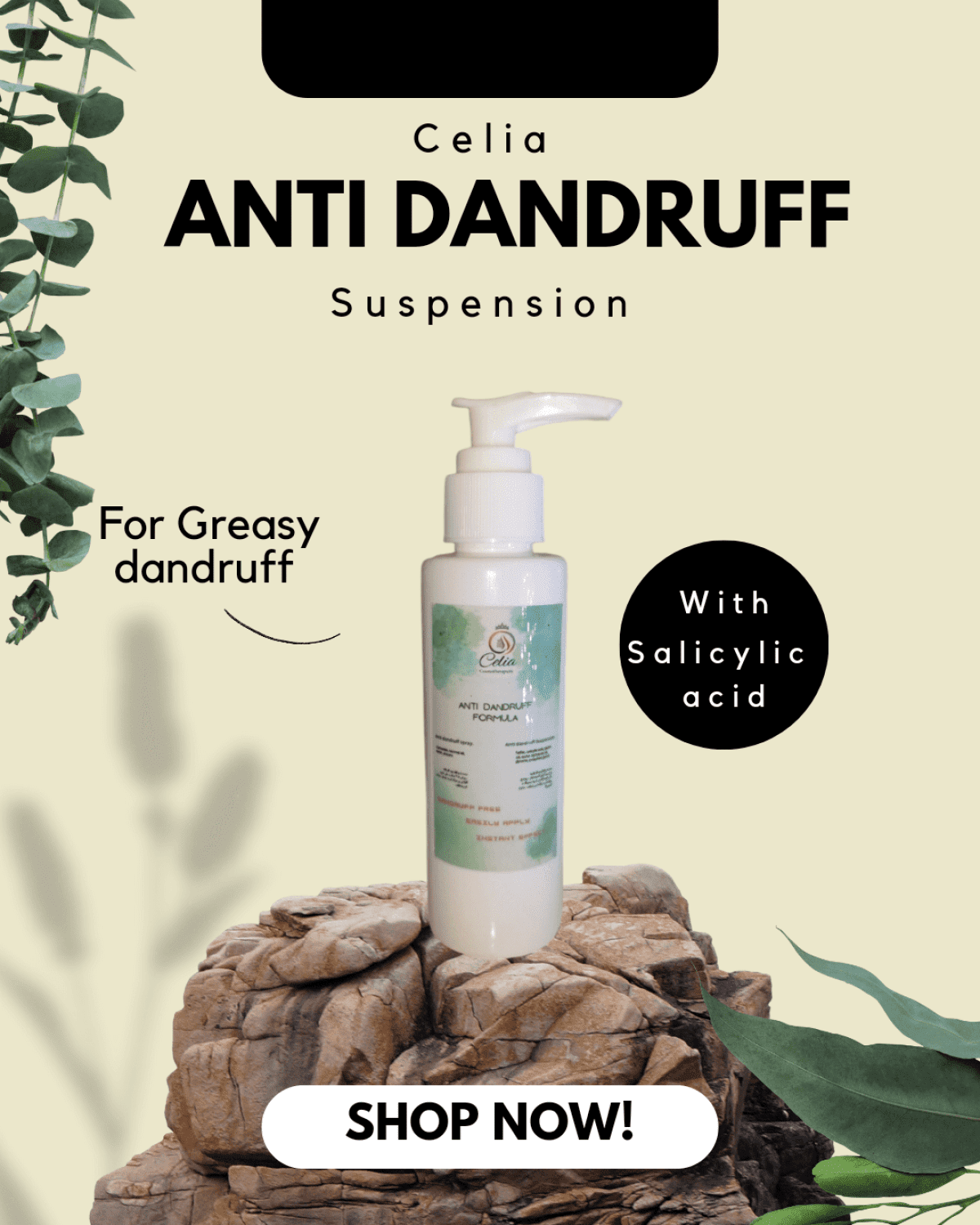 Celia Suspension for treating oily dandruff is a suspension that contains salicylic acid, natural oils, and sulfur to treat oily dandruff and get rid of the fungus that causes it permanently. With use, it disappears completely while maintaining the moisture of the scalp. In addition, it is composed of 100% natural ingredients and moisturizing substances are added to it. Size: 120 ml How to use: Shake well, then place on the scalp for half an hour, then wash with Celia sulfate-free anti-dandruff shampoo.