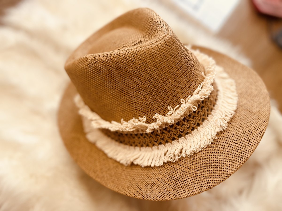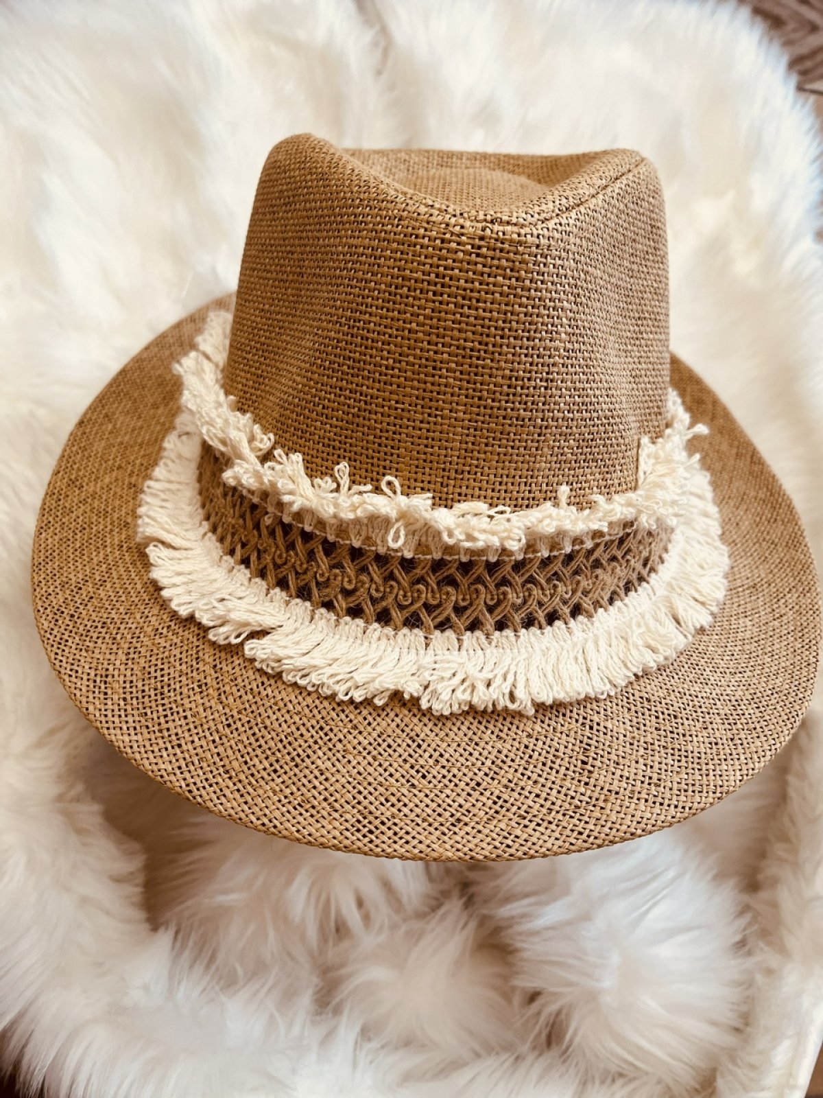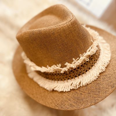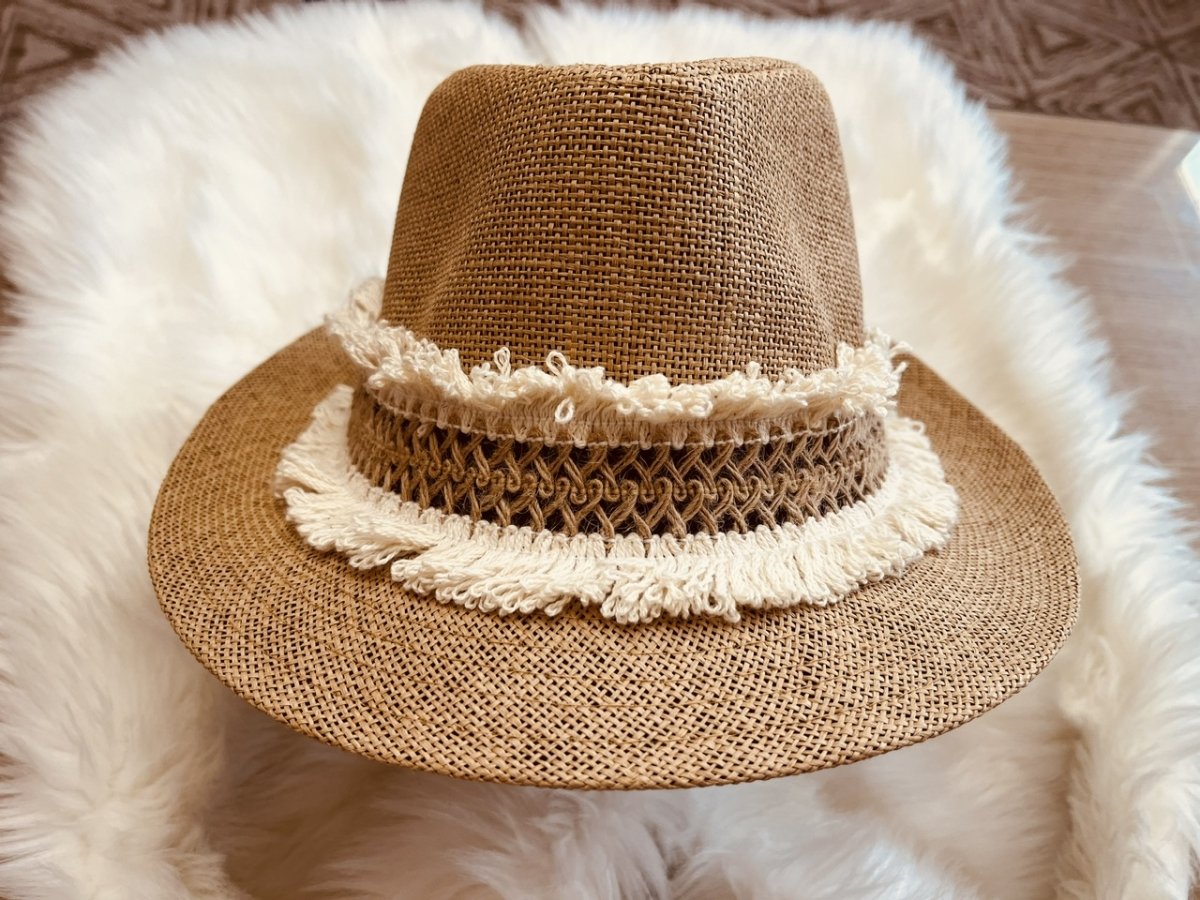 This is a stylish straw hat that features a modern and attractive design. The hat is decorated with a wide band of assorted white decorations, adding a touch of elegance and simplicity to the design. White decorations vary between hanging fringes and decorated fabric, giving the hat a distinctive and unique character.