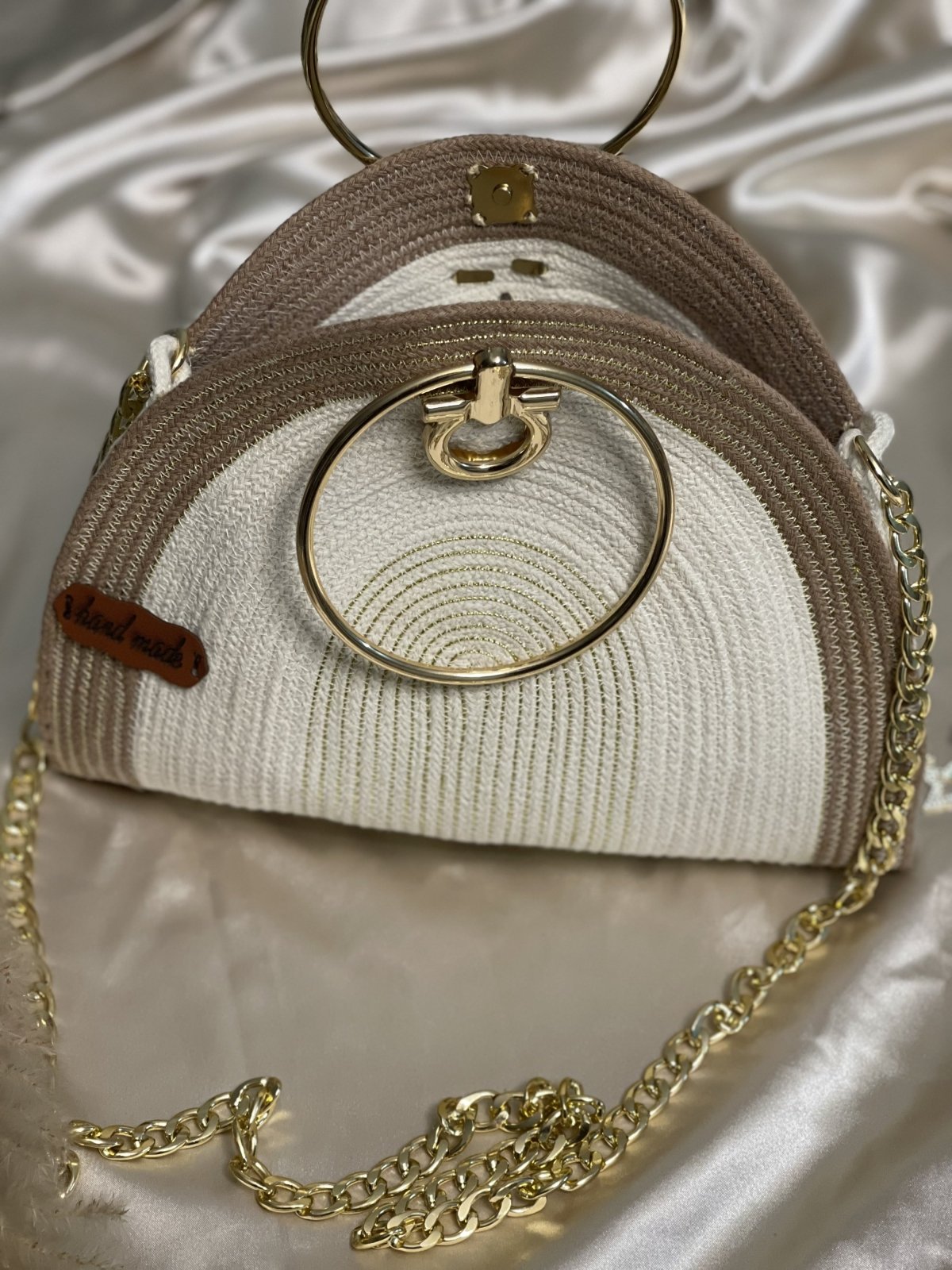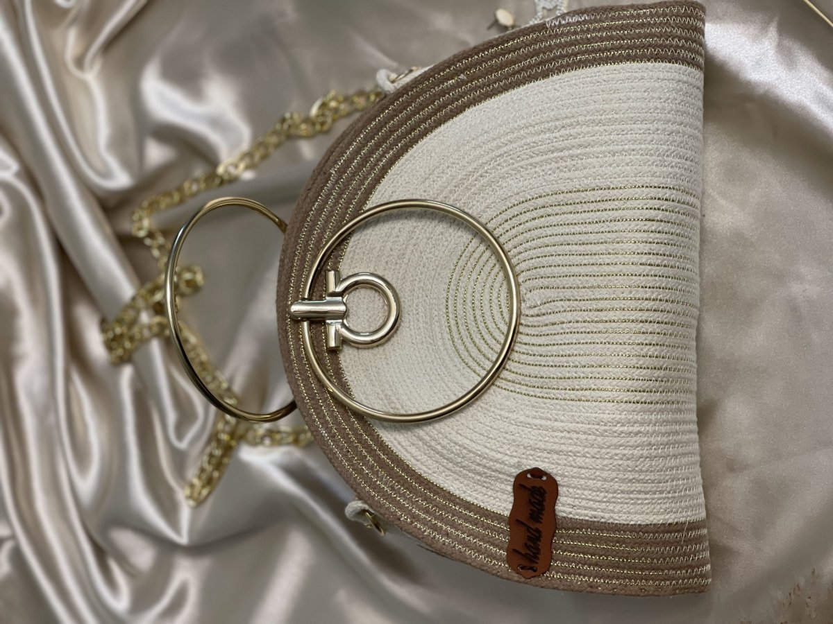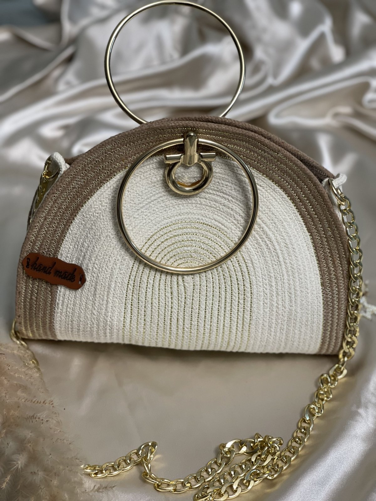 A 27*23 corduroy bag with a metal handle in off-white, camel and gold colors
