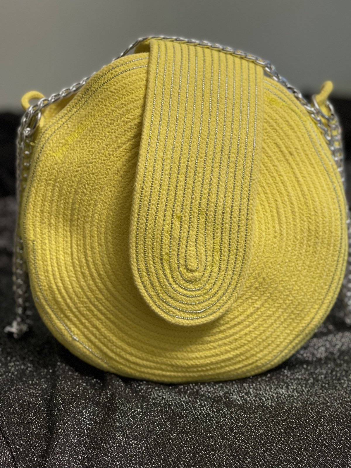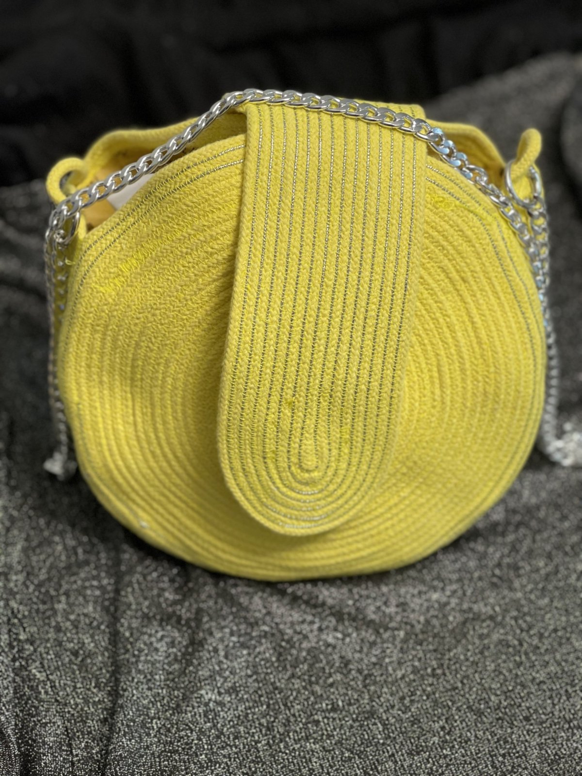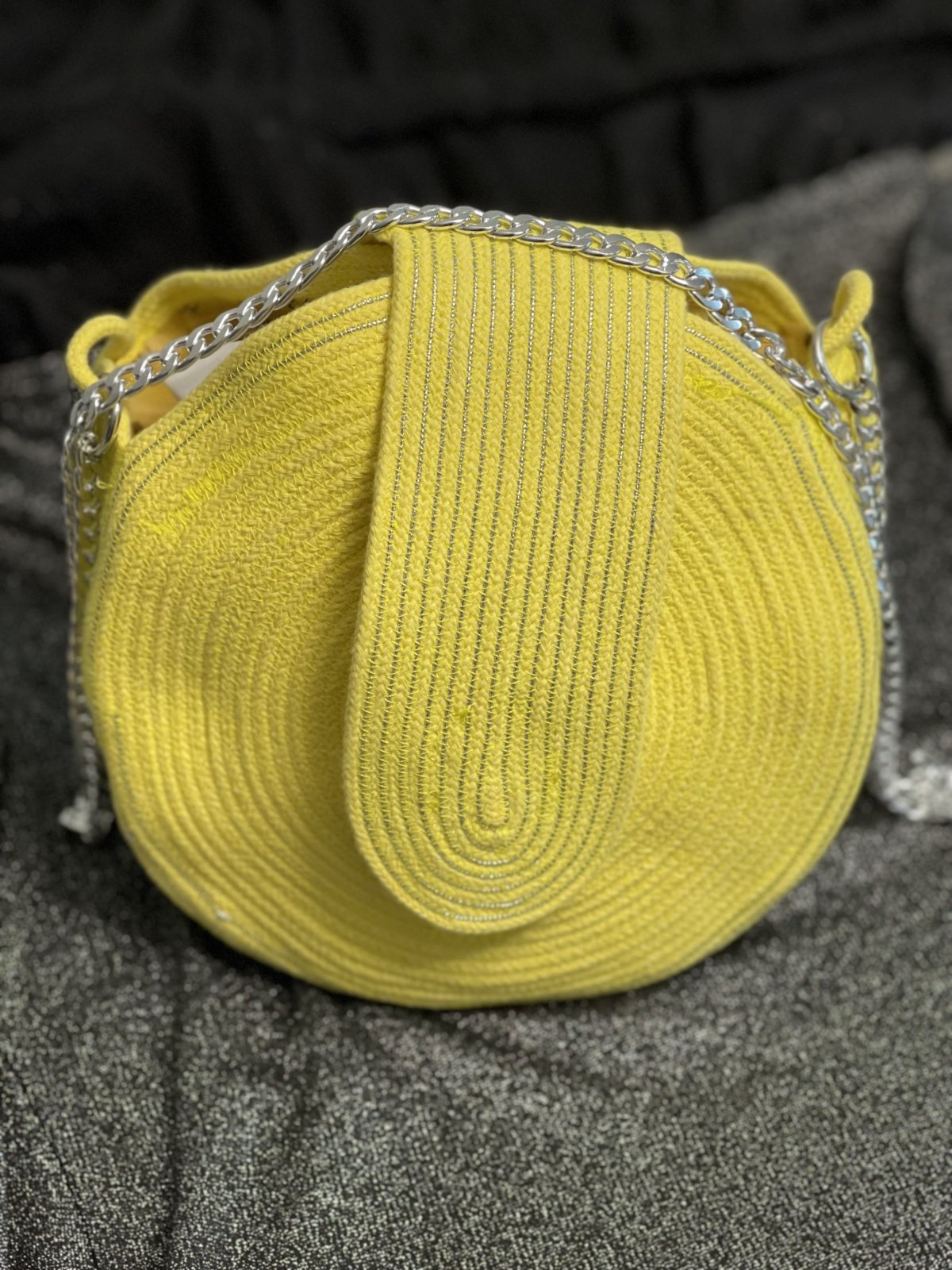 Yellow bag in silver made of cotton cord, round shape, size 25*23