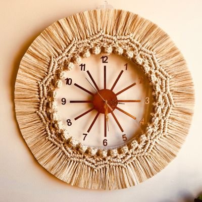 A wall clock with a distinctive artistic and handmade design. The watch consists of a central circle. The outer frame of the watch is made of thick, braided macramé style threads, giving the watch a chic bohemian look. The outer edges of the frame are covered with thin threads distributed symmetrically, creating an attractive visual effect. The overall color of the clock is natural beige, making it an elegant decor piece that suits various interior decor styles.