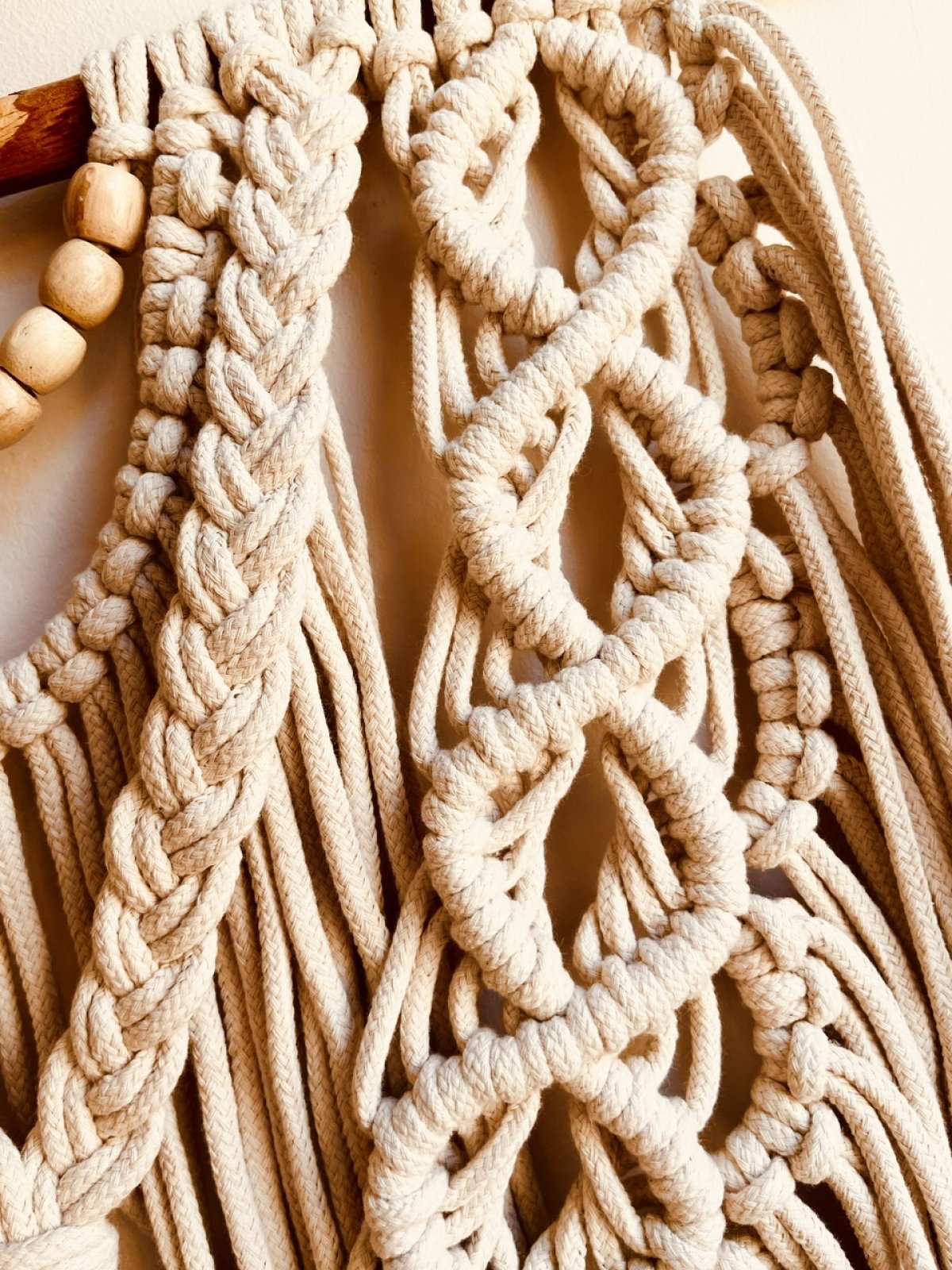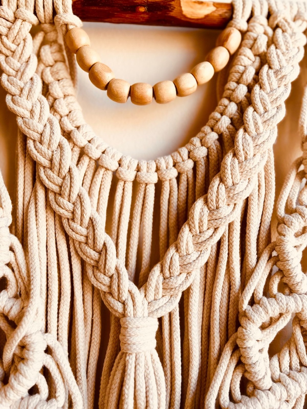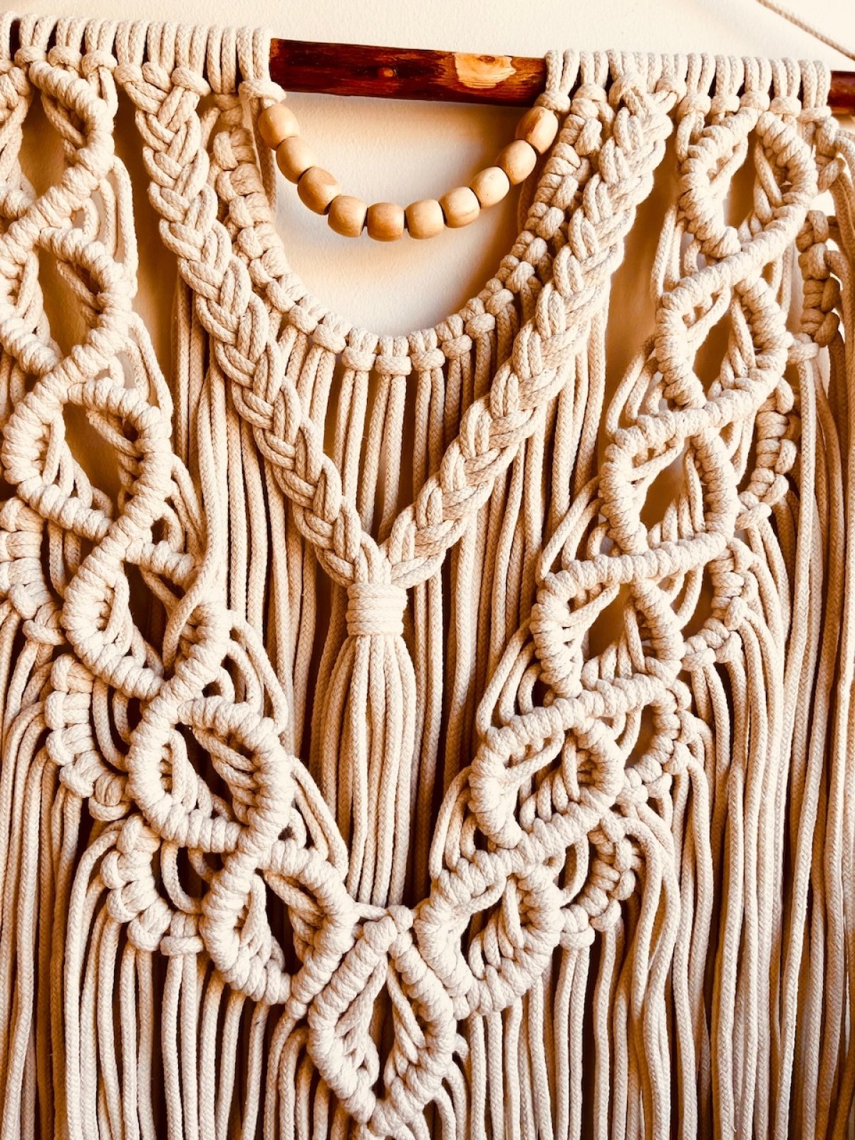 Simple and elegant macrame, 50cm wide, designed to be a great wall decor piece. Macrame is composed of durable threads of natural cotton, delicately knotted in an artistic pattern that reflects the beauty of traditional handicrafts. The macramé is decorated with wooden beads distributed harmoniously between the threads, giving it a warm and natural touch. Wooden beads in their rich colors contrast beautifully with white or cream threads, adding depth and appeal to the design. This macrame adds a warm, bohemian touch to any room, and can be hung in the living room or bedroom to complement the decor in an elegant, simple style.