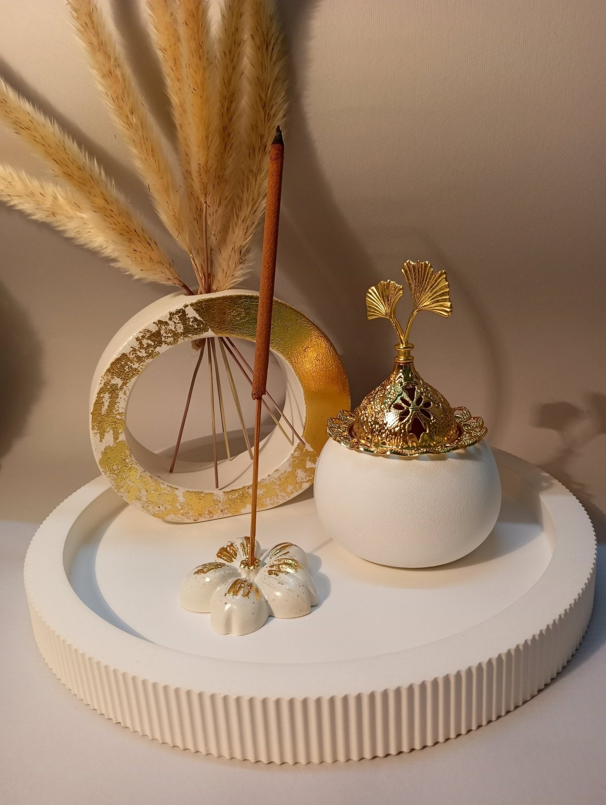 concrete set consisting of a 25-inch tray, a hollow vase inlaid with gold leaf, a royal incense burner, and an incense holder