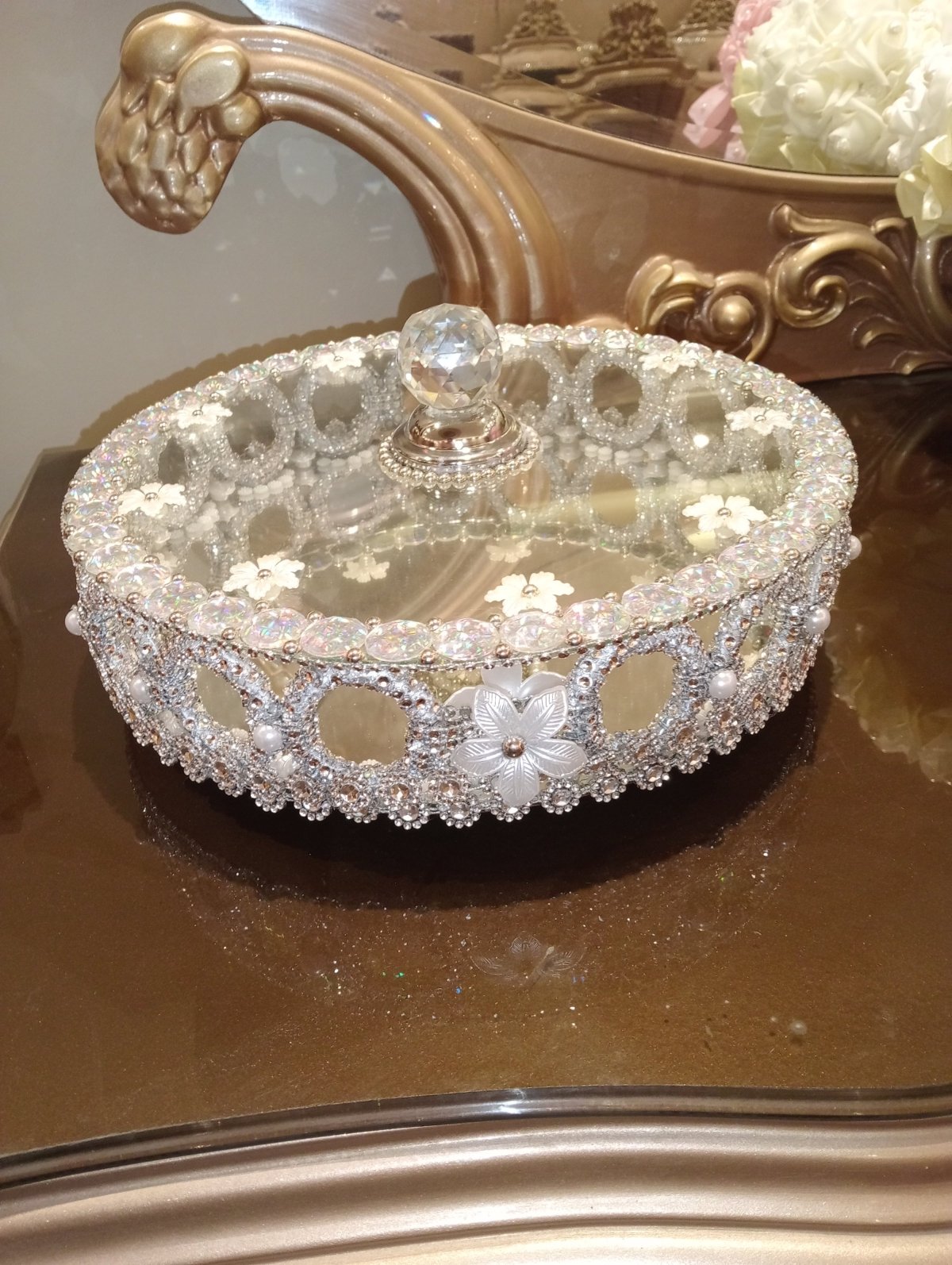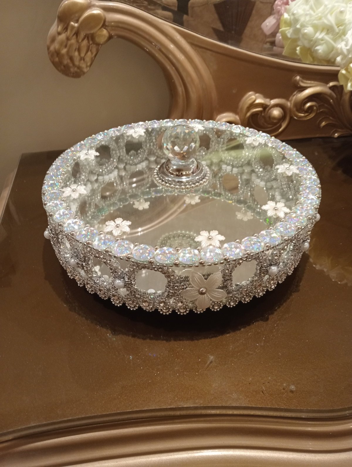 It is a 35 cm mirror base with high stability fixed on it with metal rings covered with two layers and decorated with acrylic pieces for more beauty. It has a transparent glass cover that allows you to see what is inside without lifting it