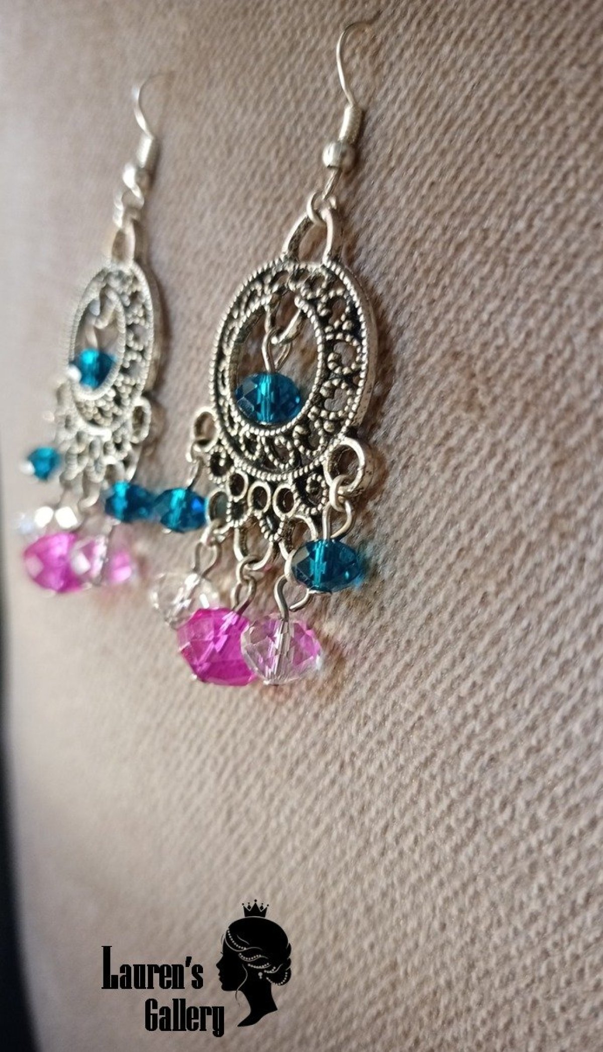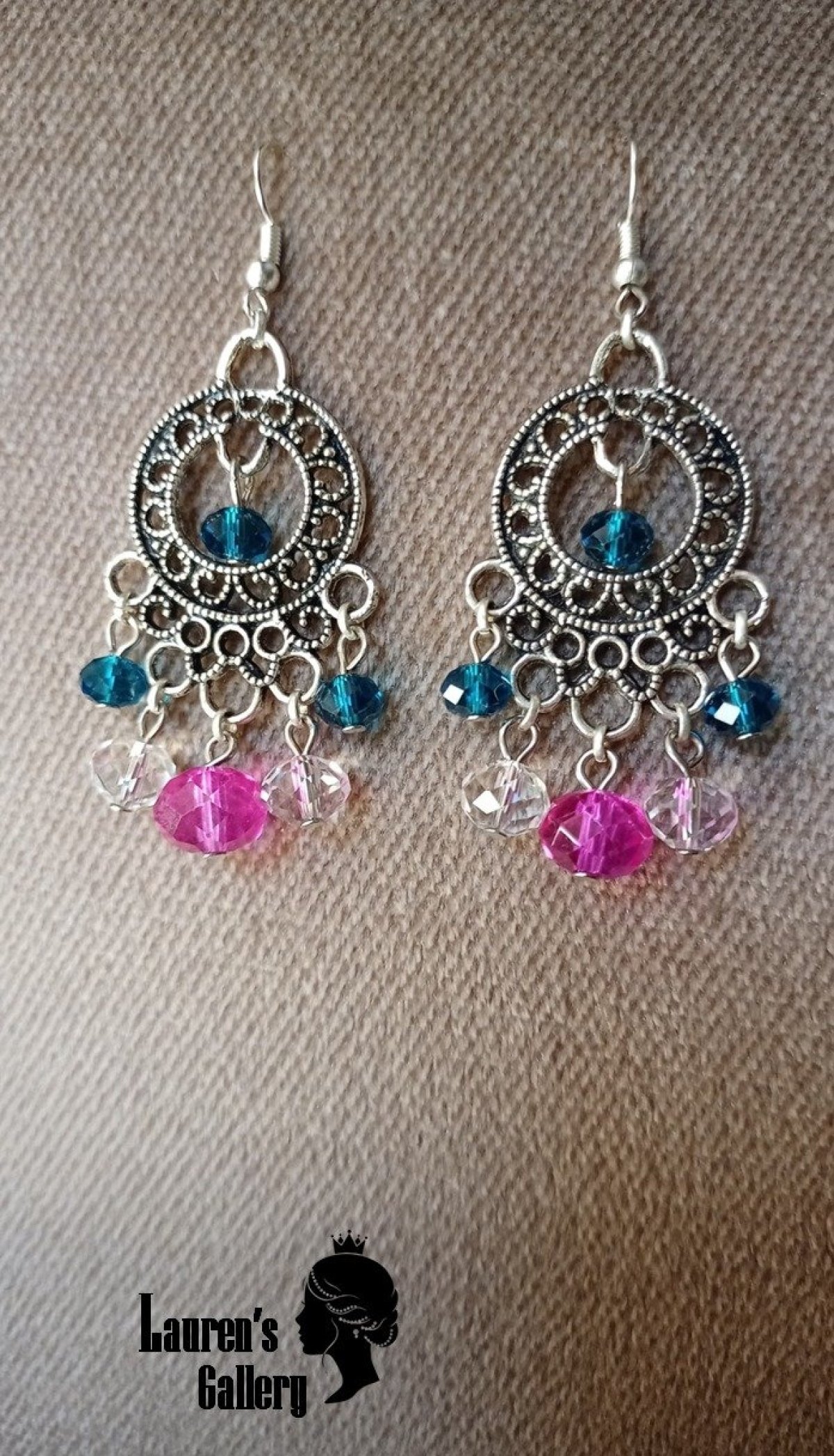 Earrings have a different colours and sizes of crystal.