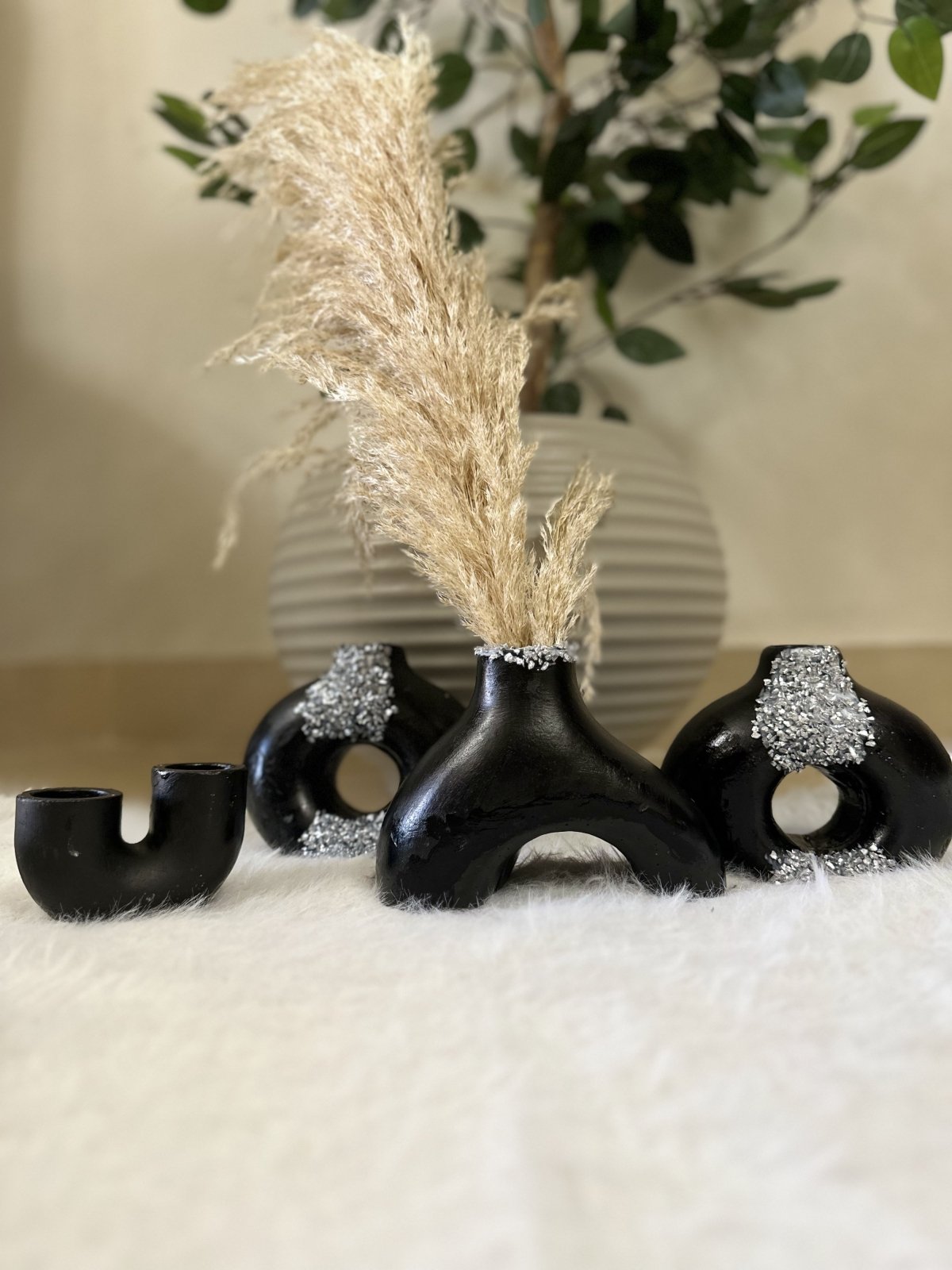 Donut vases made of gypsum. They consist of 3 vases, one of them is available in the shape of a cup, and they come with a gift candlestick and the color is available to change.