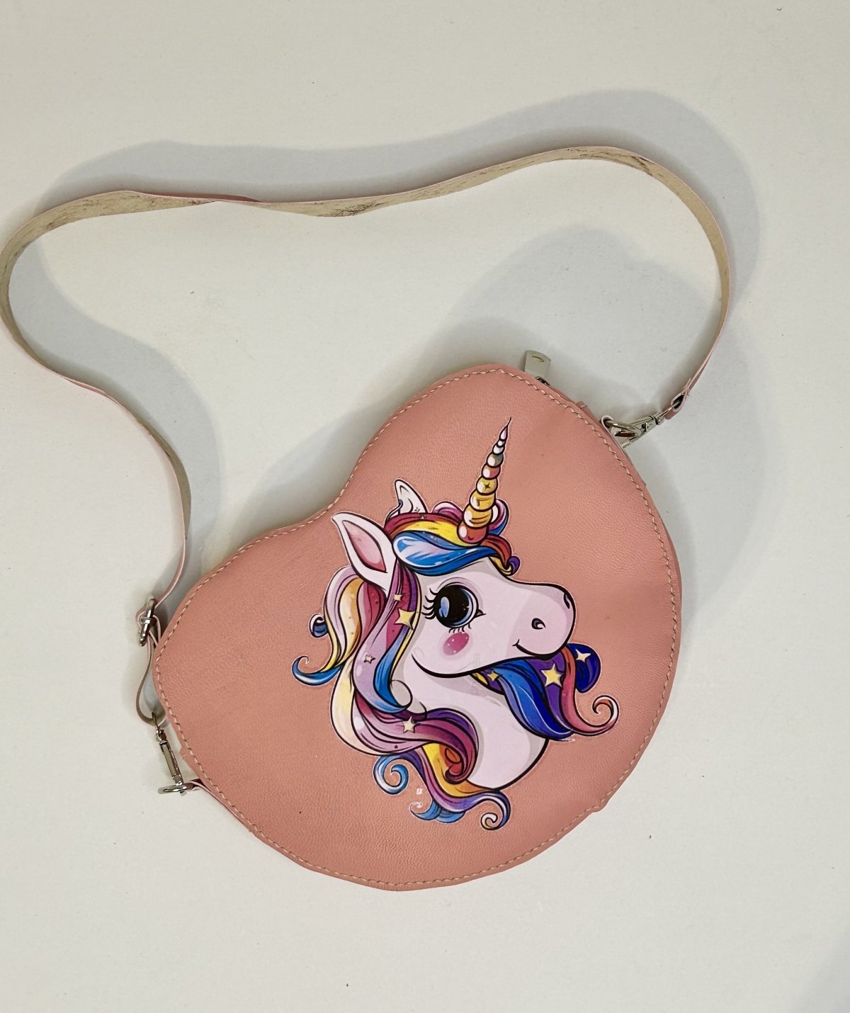 A girls' heart-shaped bag with a unicorn drawing for a 6-year-old girl. It can be made in any shape and any drawing. It will be sold out in 10 days to two weeks.