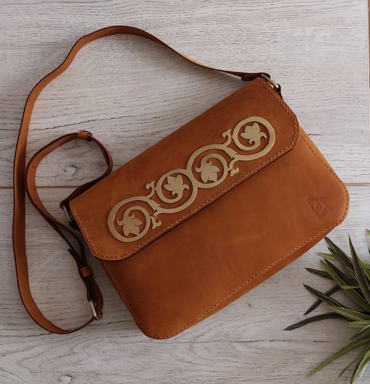 Natural leather bag with copper charm genuine leather lining. there is an internal pocket