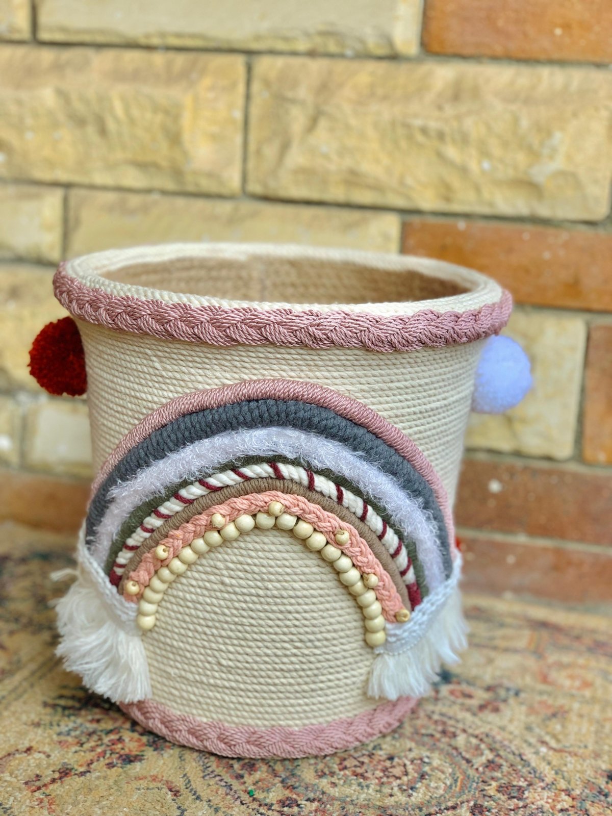 Basket with macrame threads