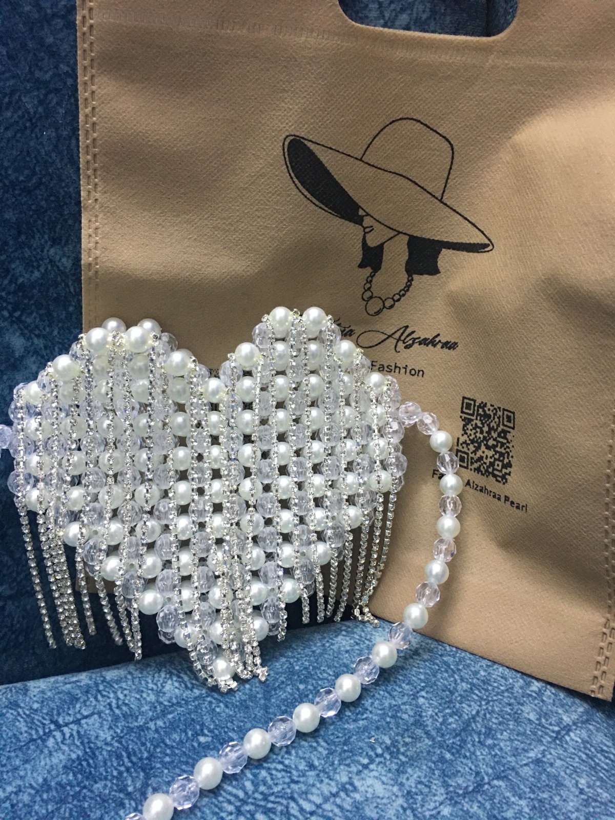 Handmade bag with white beads and white crystals, made with durability and strength, and with strips of shiny diamonds added to it to add strength and difference to your look. Suitable for any night or classic outings. Shine with a beautiful and different look with a bag of your choice.