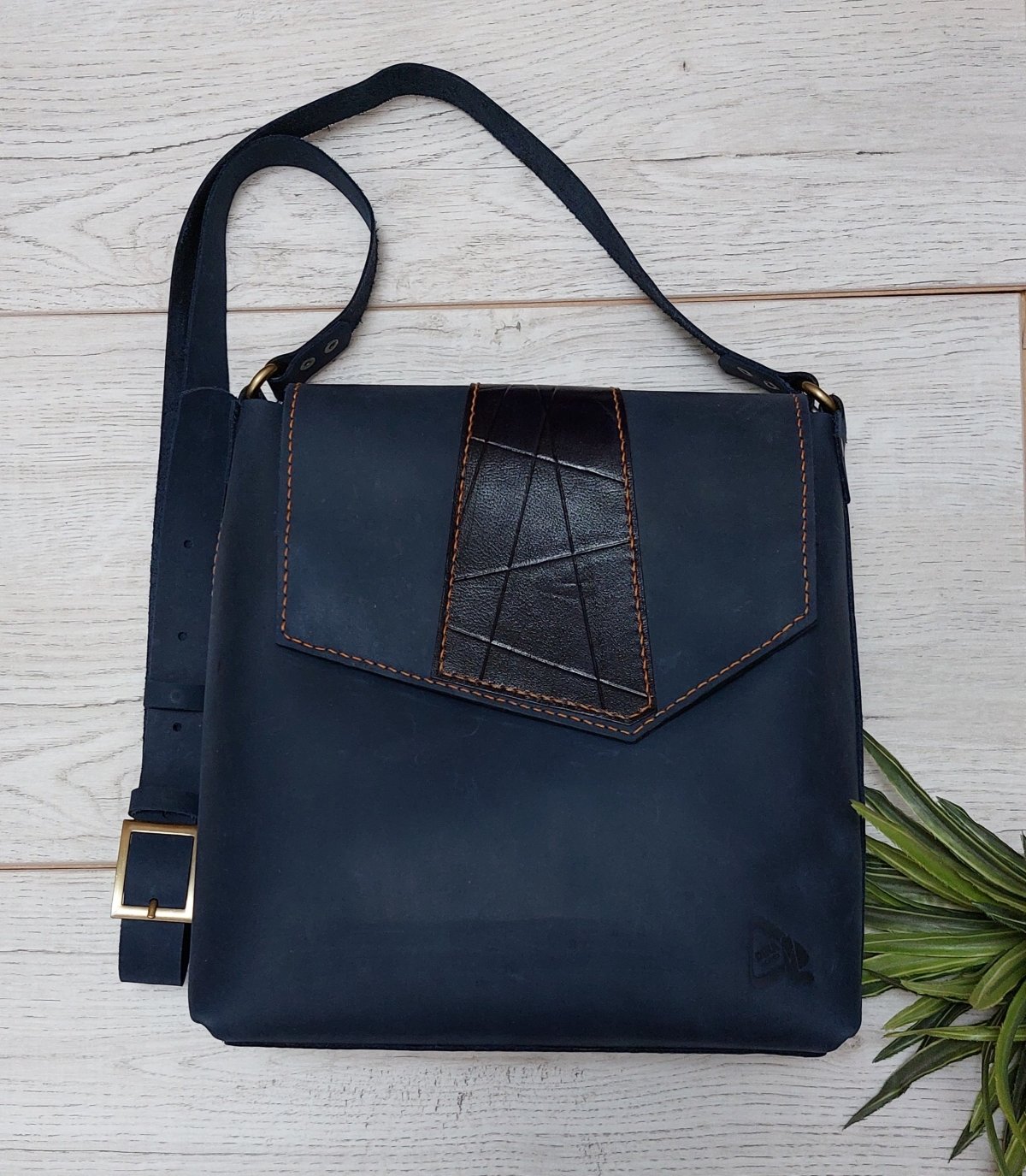 Handmade natural leather bag with a distinctive design with a drawing on the flap. It has an internal pocket. Size 25cm wide and 26cm long