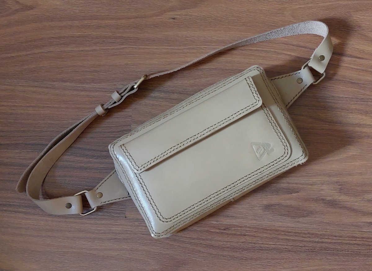 Handmade natural leather belt bag with a distinctive design, with a flap pocket on the front