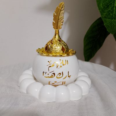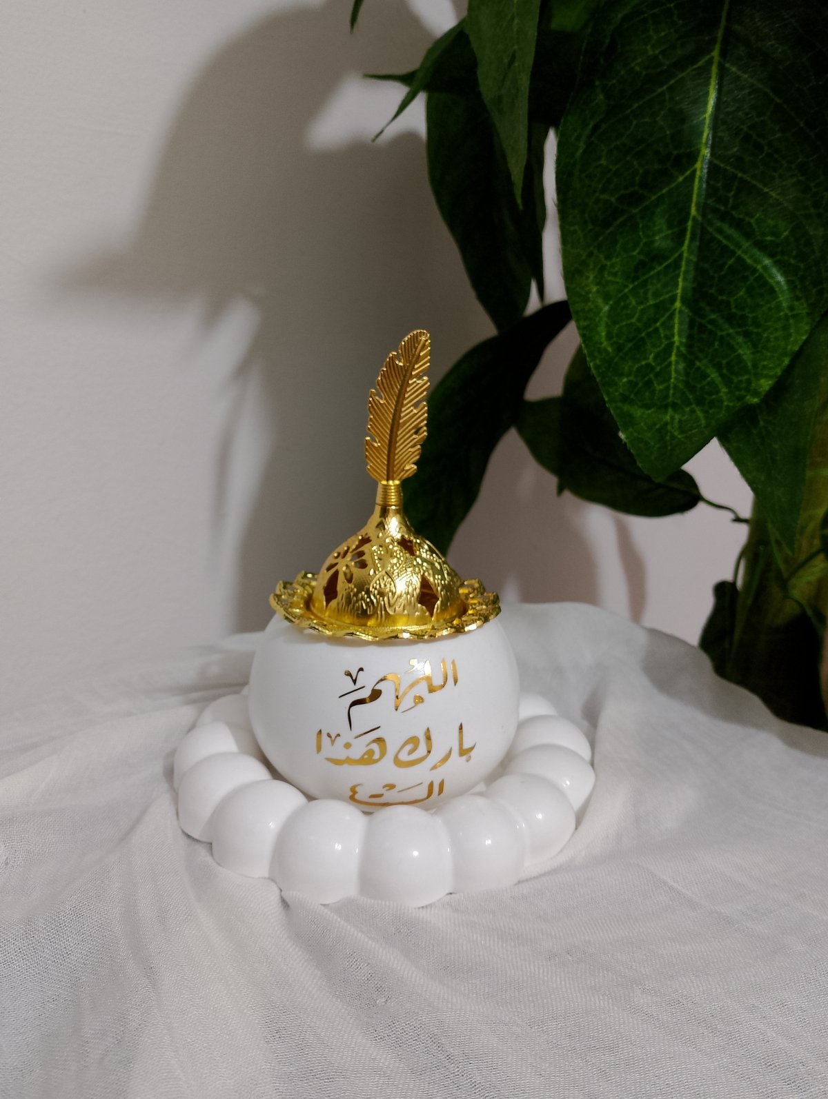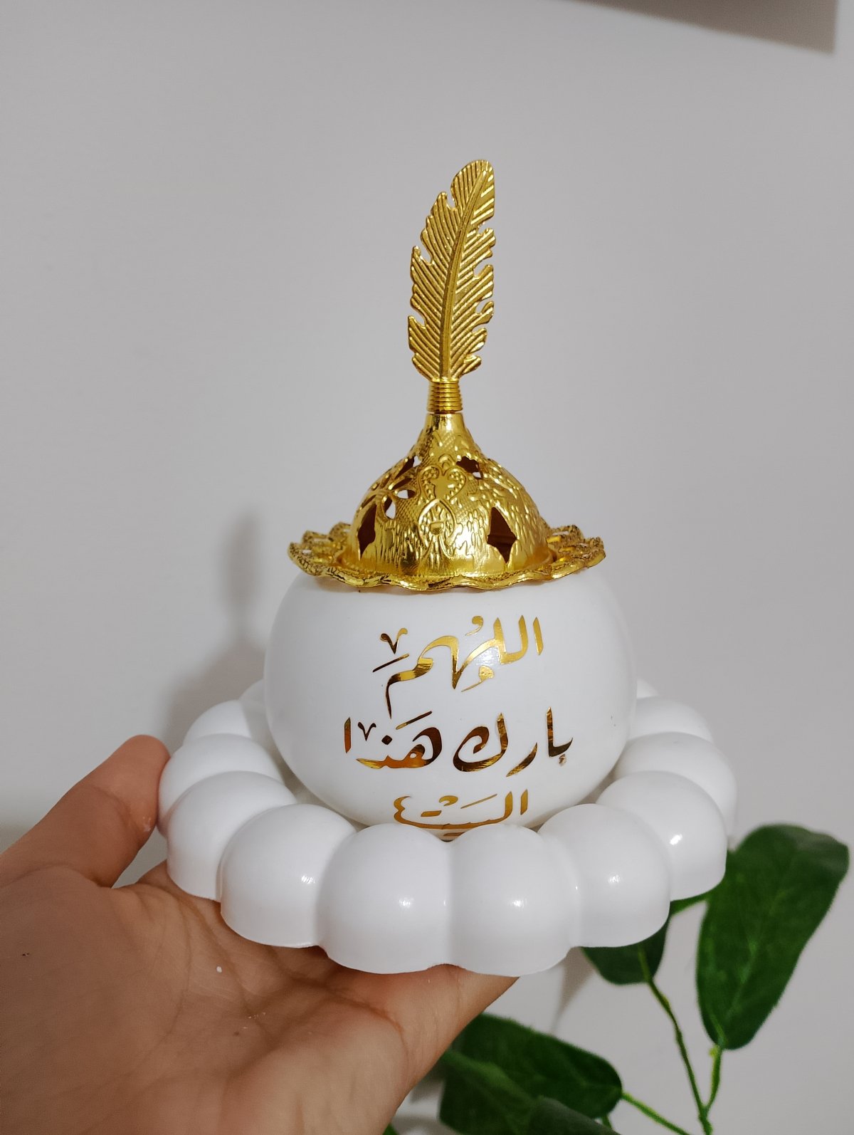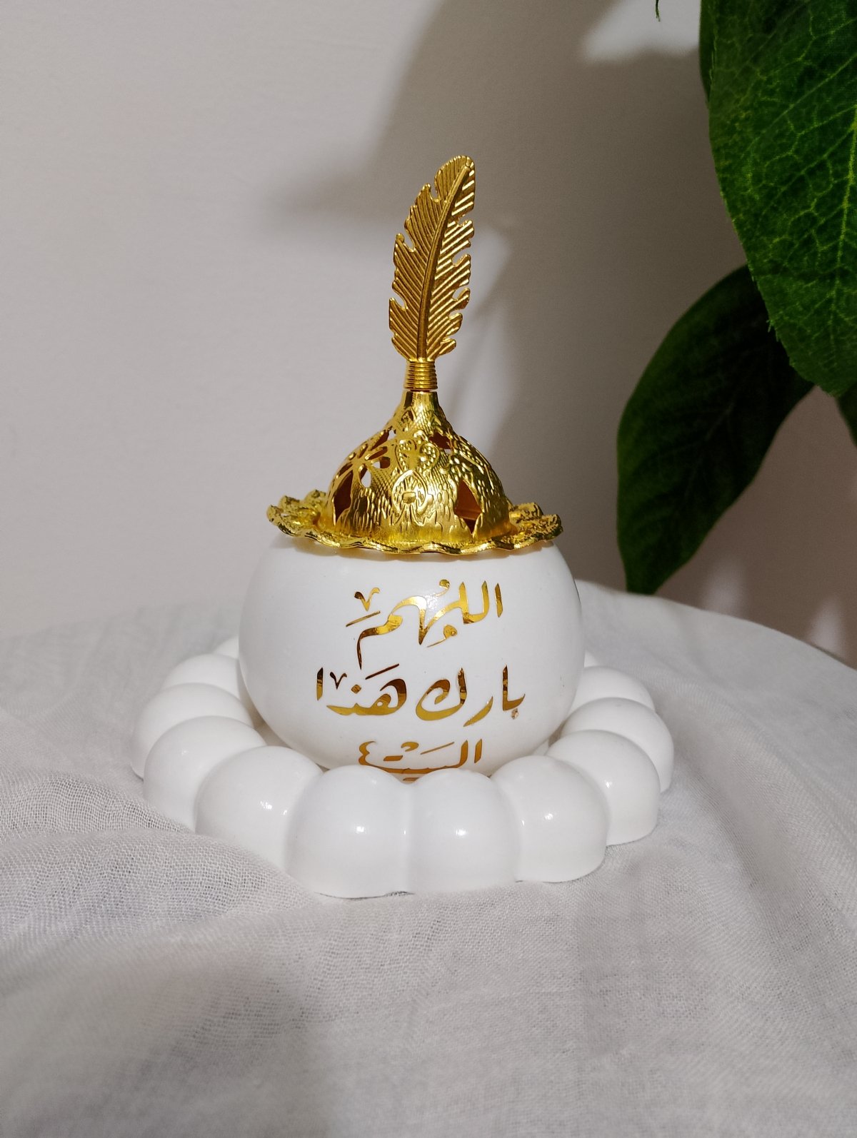 The set consists of an incense burner + a bubble base It has a white color and is made of marble It contains shiny golden vinyl (Oh God, bless this house) + a golden plate with a lid to place incense