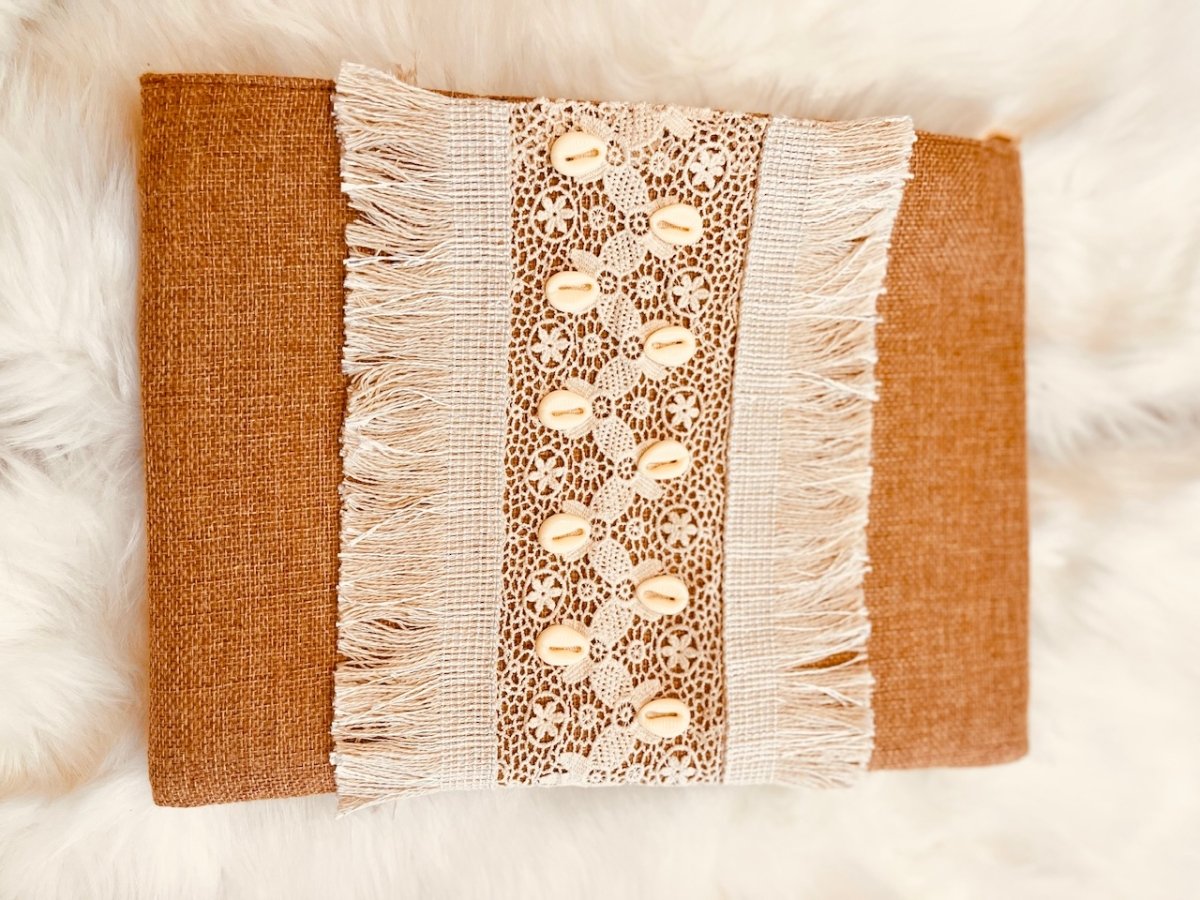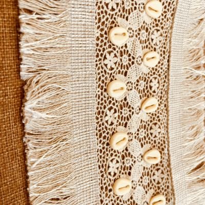 This elegant bag combines simplicity and elegance with its unique design. Made of luxurious brown fabric, it is decorated with a piece of white lace decorated with natural shells, giving it a charming nautical touch. Tasseled edges add a touch of liveliness and distinction. Perfect for your daily or evening looks, as it combines practical beauty with striking elegance.