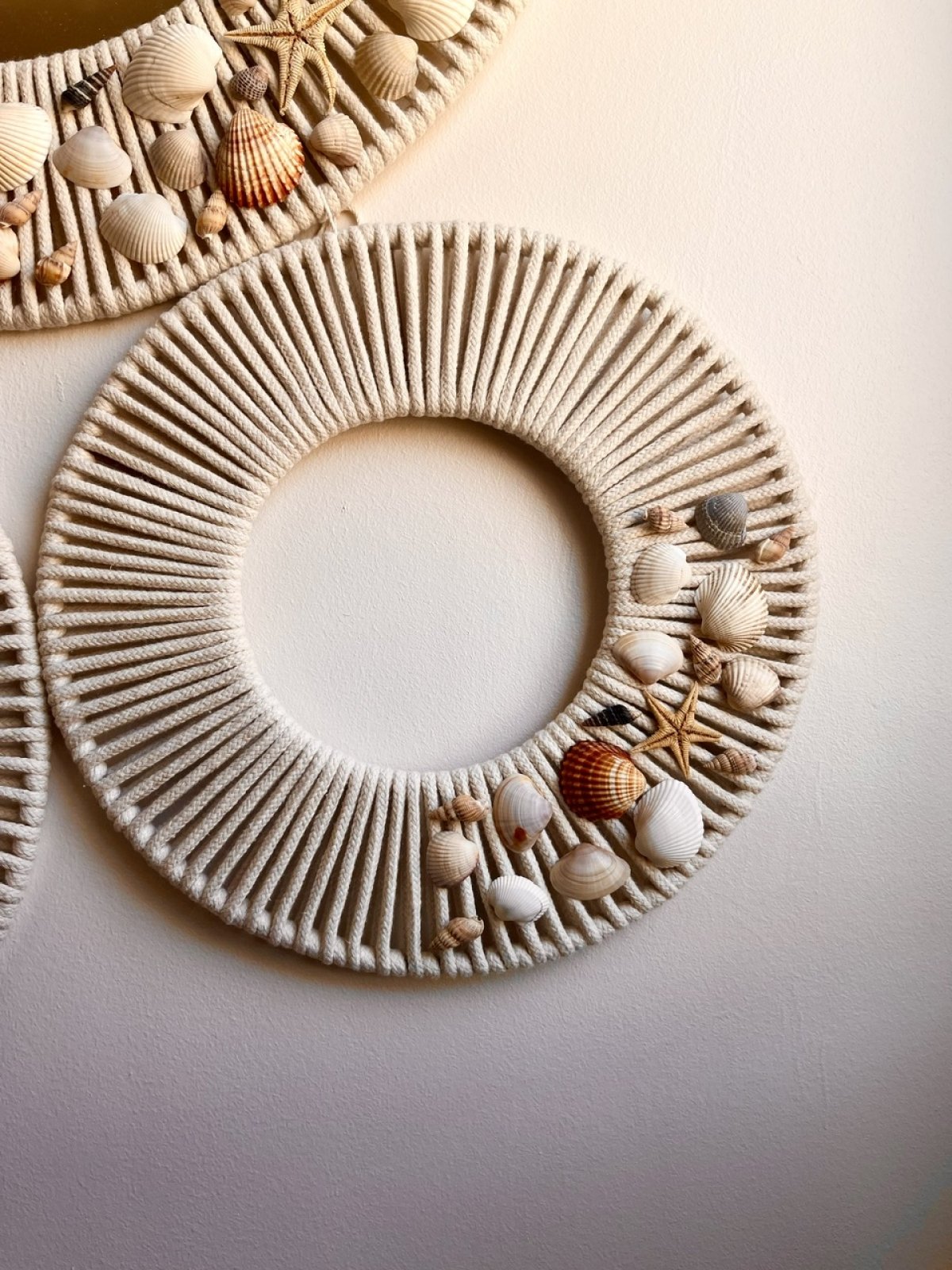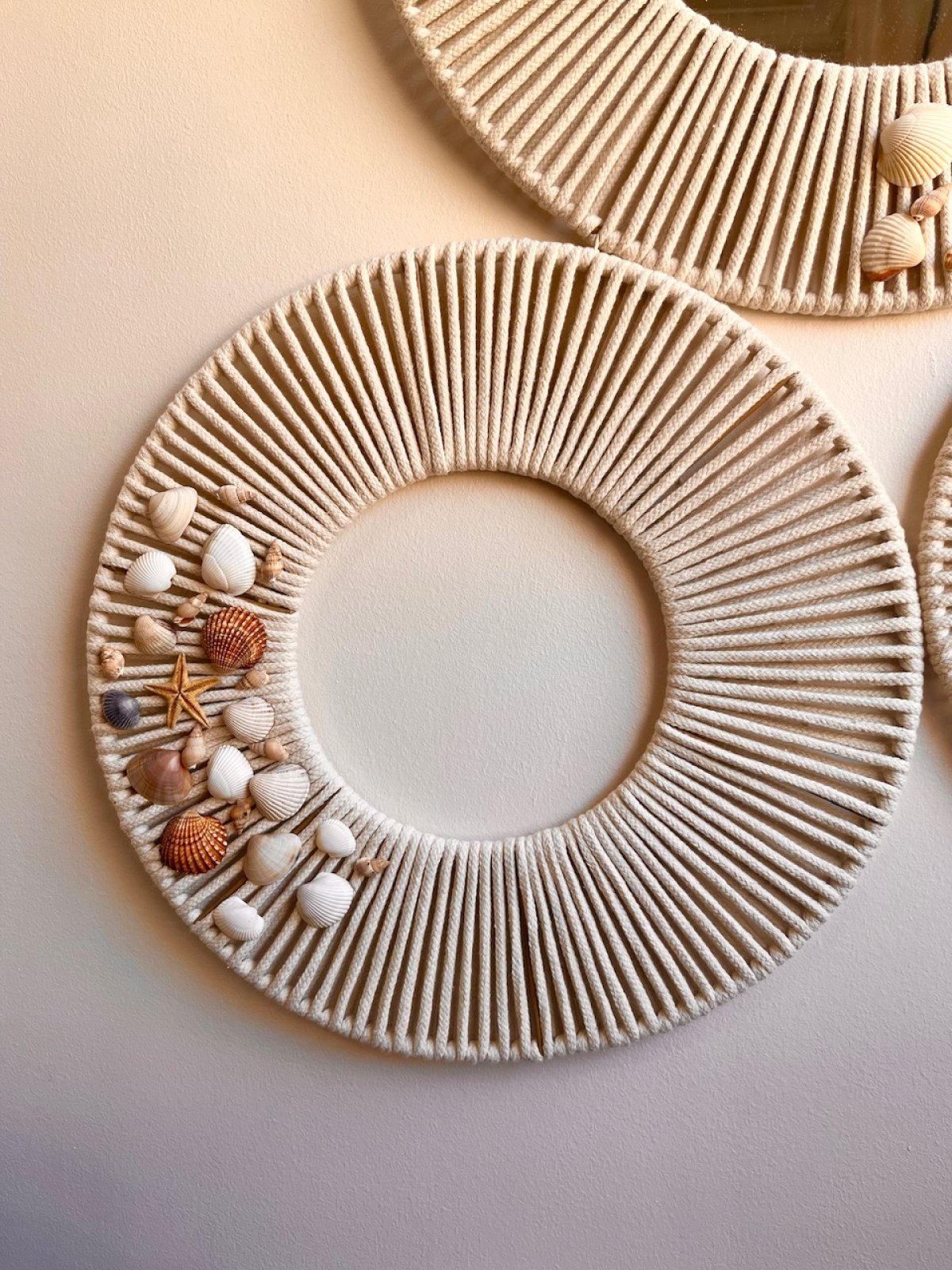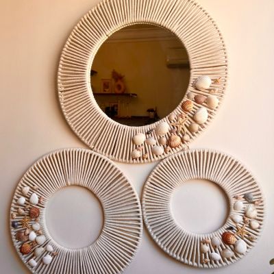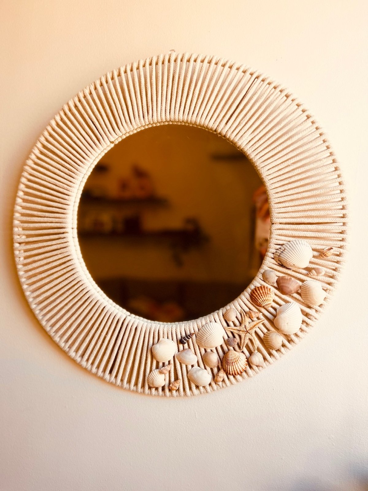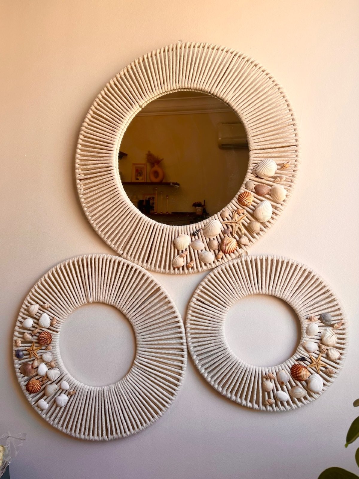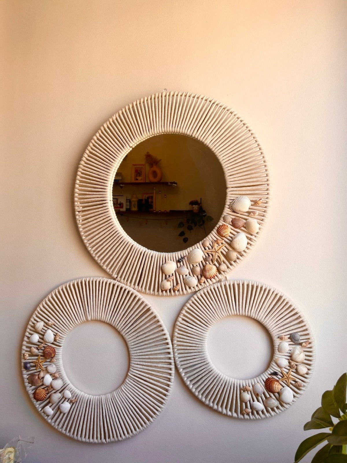 Enjoy the beauty of the sea in your home with this wonderful set of mirrors decorated with natural shells. The set contains circular mirrors with a frame made of sturdy white thread, along with two mirrorless frames, giving it a unique nautical character. The shells carefully scattered around the frame add a natural and elegant touch, making it perfect for decorating any room in the house. Whether you want to bring a touch of nature into your living room or bring a calm atmosphere to the bedroom, this set will bring you a sense of calm and natural beauty.