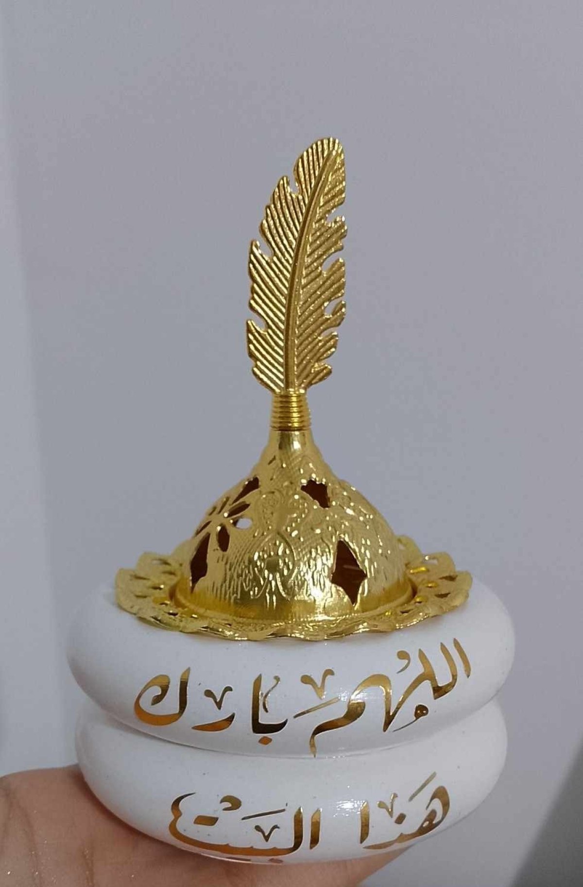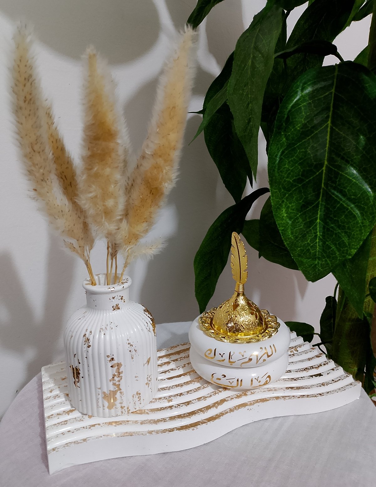 A contemporary decor set consisting of a wavy coaster + a ribbed vase with imported roses + a shiny gold vinyl incense burner (Oh God, bless this house) + a golden plate with a lid for incense