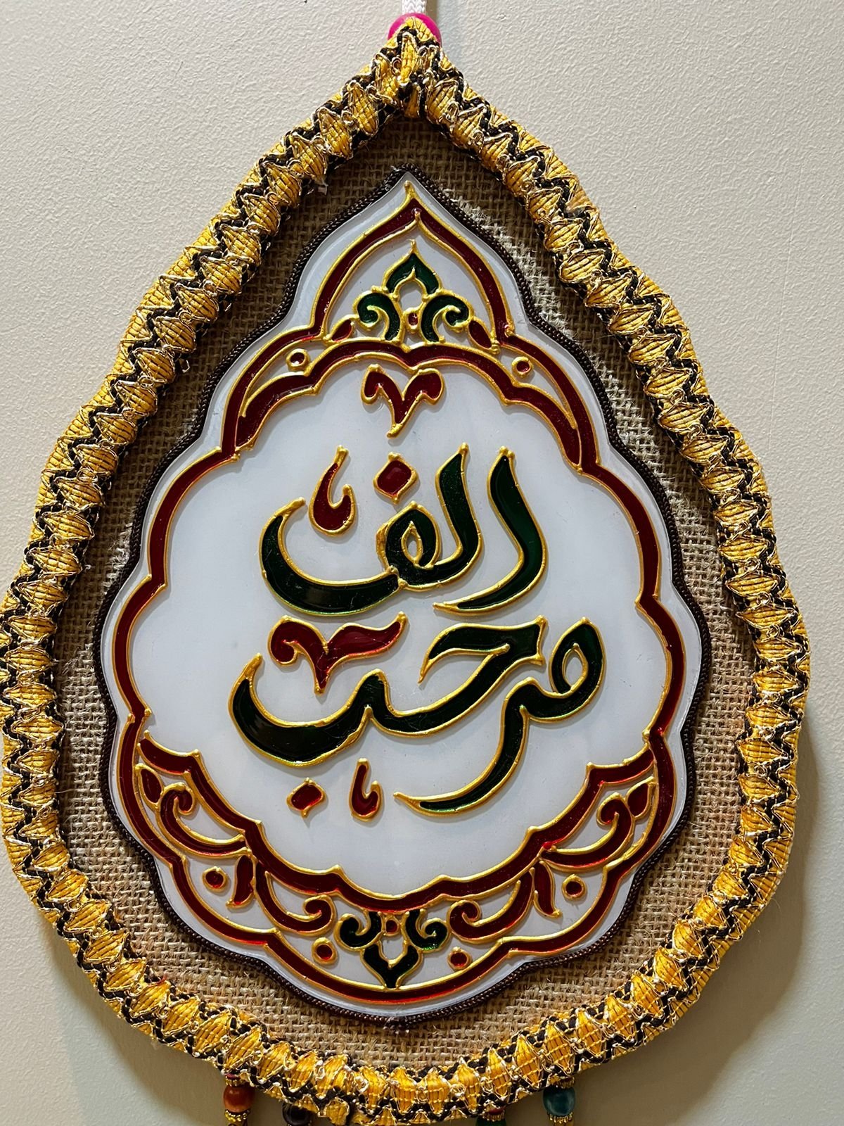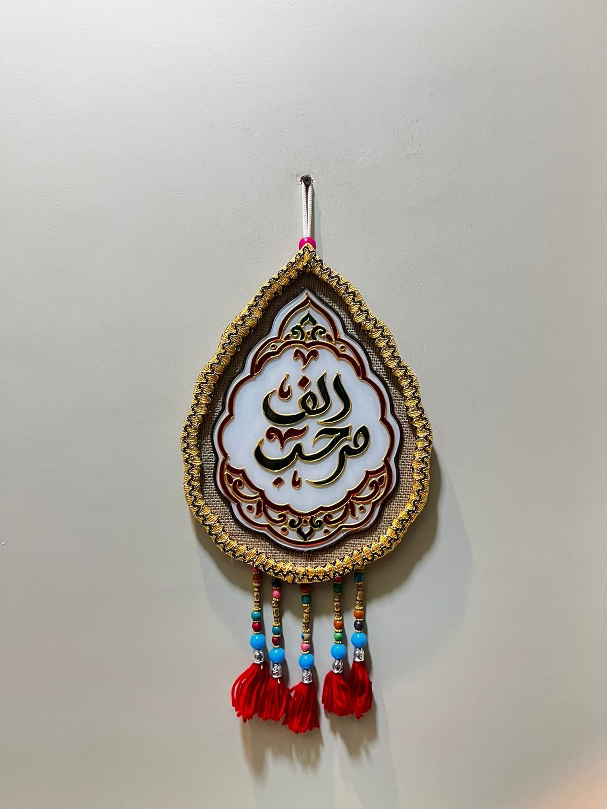 Wall hanging traditional decorative pendant to welcome visitors, hand made which makes it unique, you can hang it on the door or the wall, made of wood, cleric and burlap