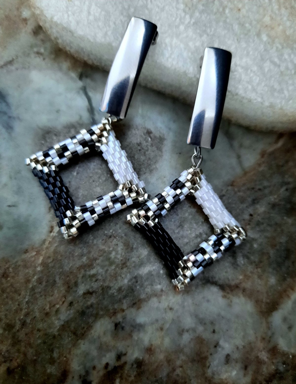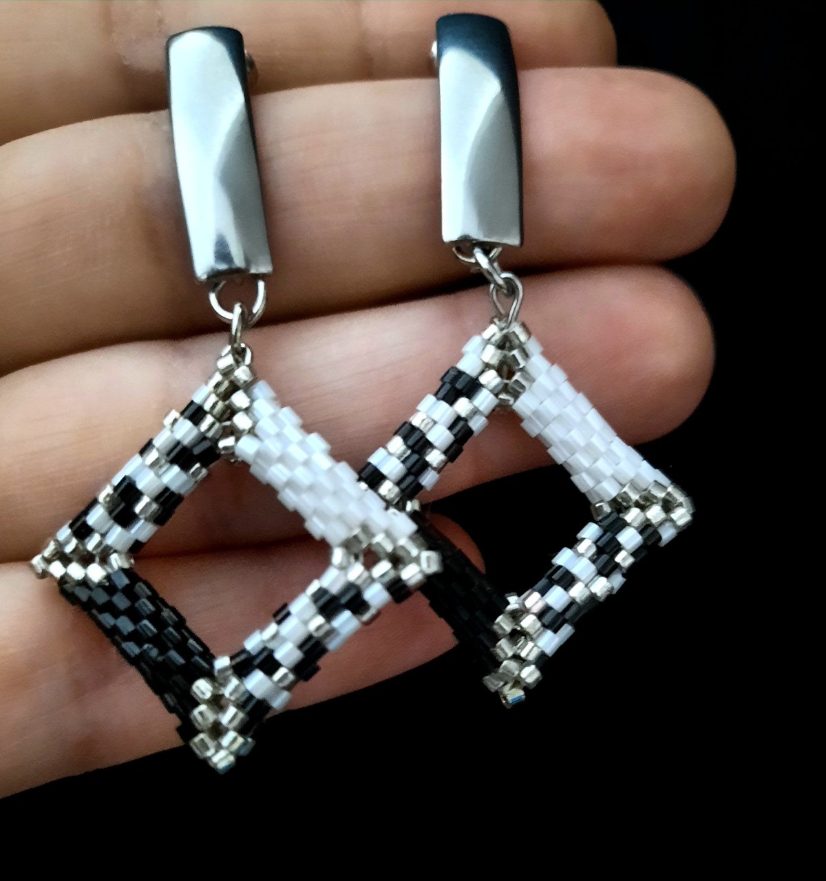 Earrings with a three-dimensional square shape, mixed with white, black and silver colors.. Made of Miyuki beads (Available in more than one color) All metal materials used do not rust or change color and do not cause allergies.. Its weight is very light