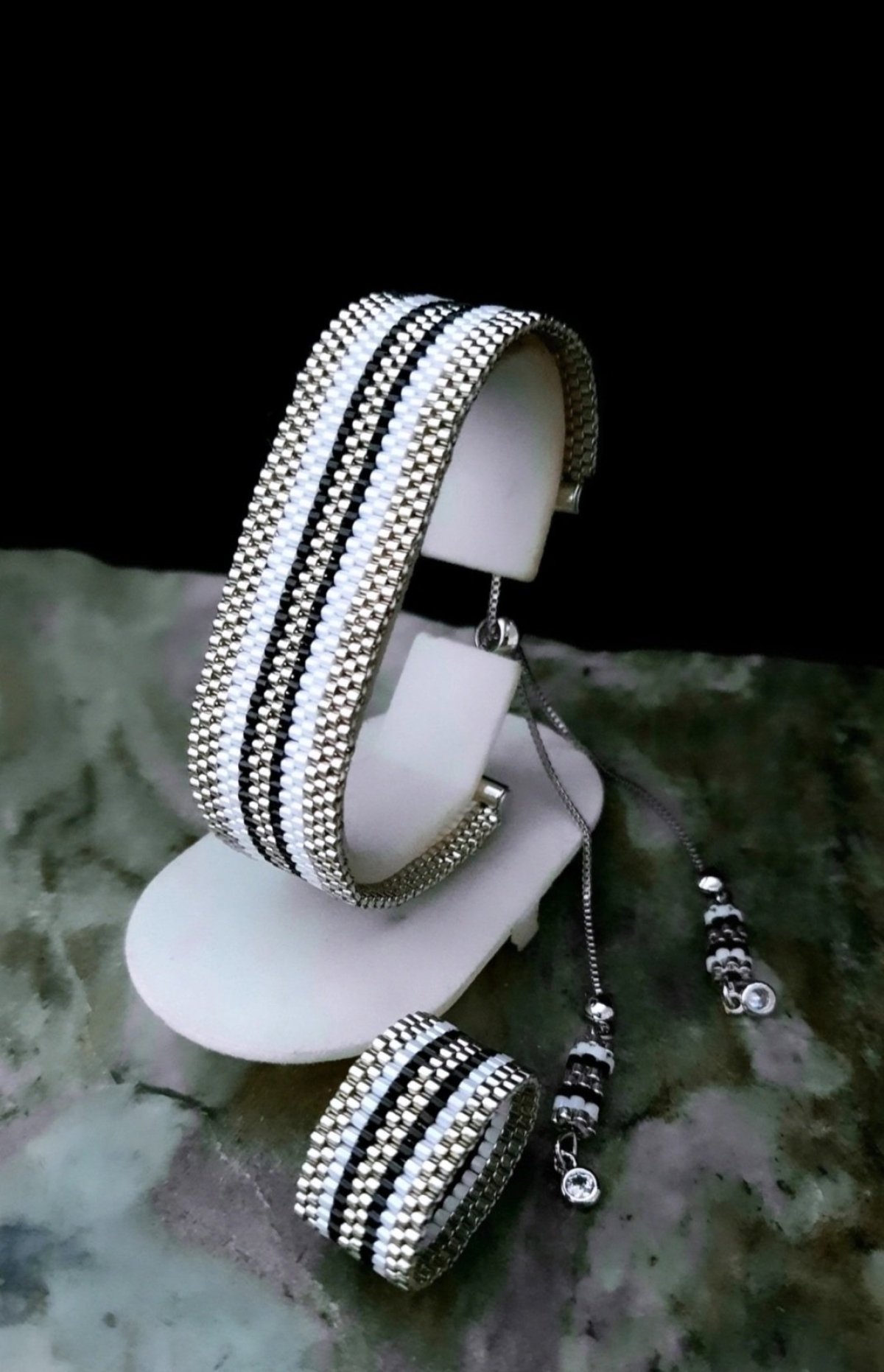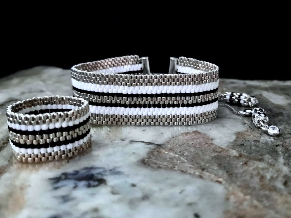A bracelet designed with thin, parallel, harmonious lines of Miyuki beads... with an interplay of silver, white and black colors, with a soft and simple design and a modern touch... In addition to a lock with a part of the same colors on the ends as the bracelet... and also a ring with the same style and colors All metal materials used do not rust or change color and do not cause allergies.. Its weight is very light