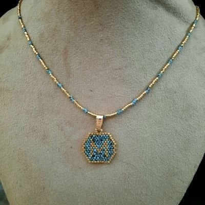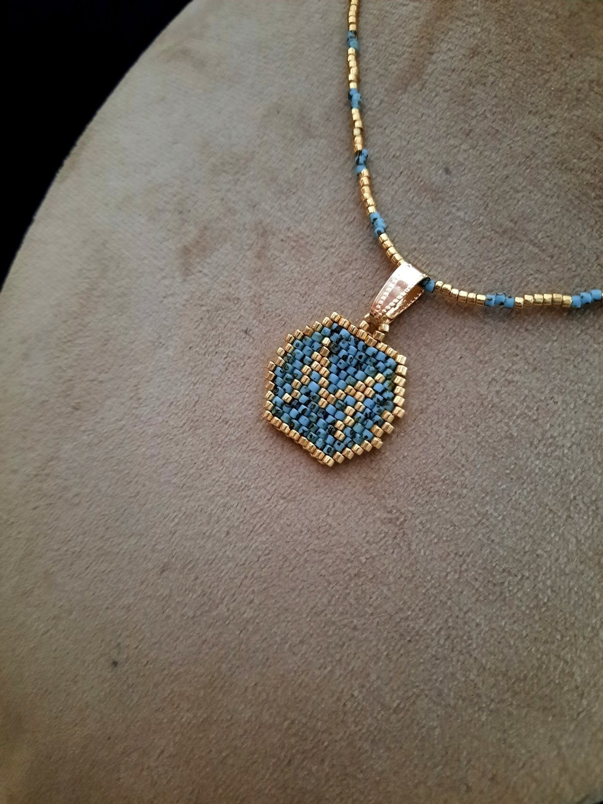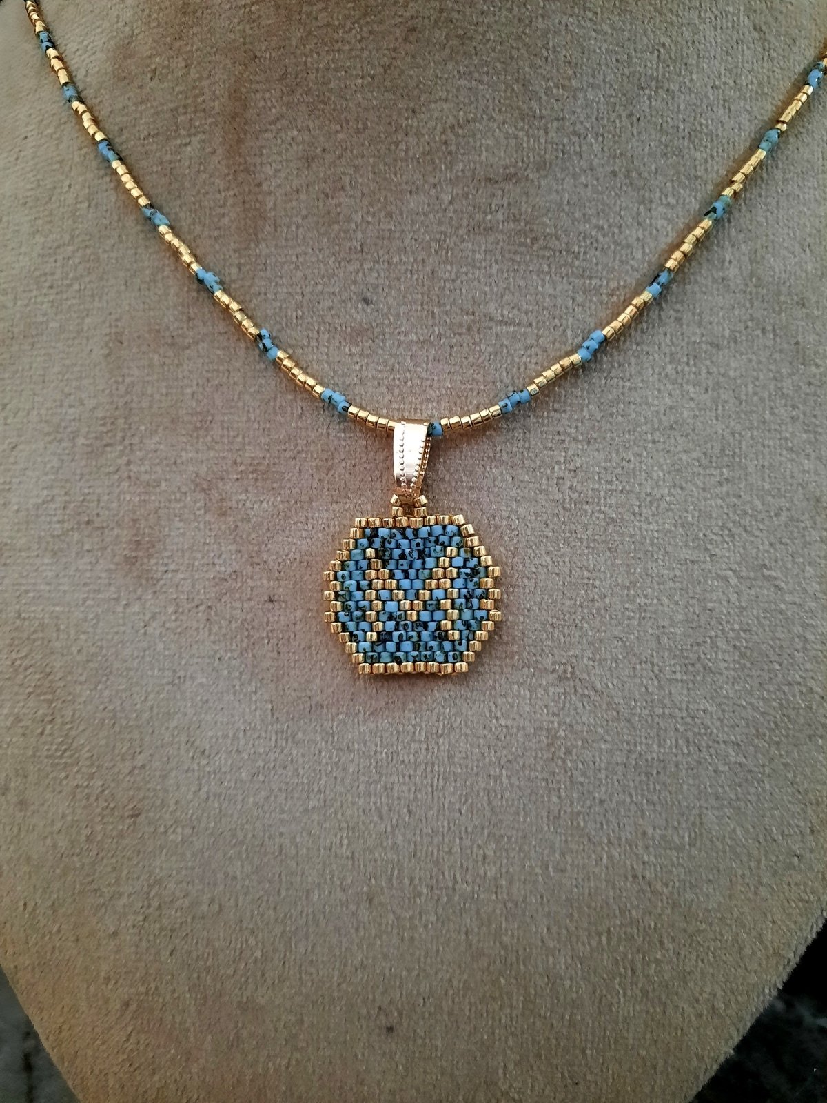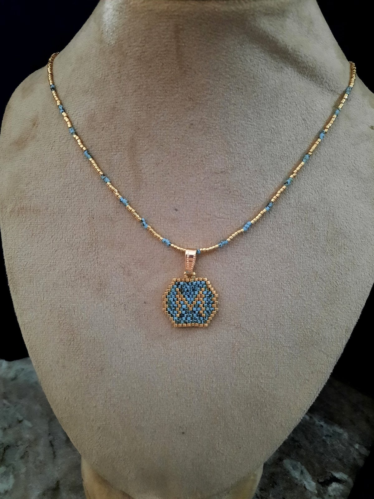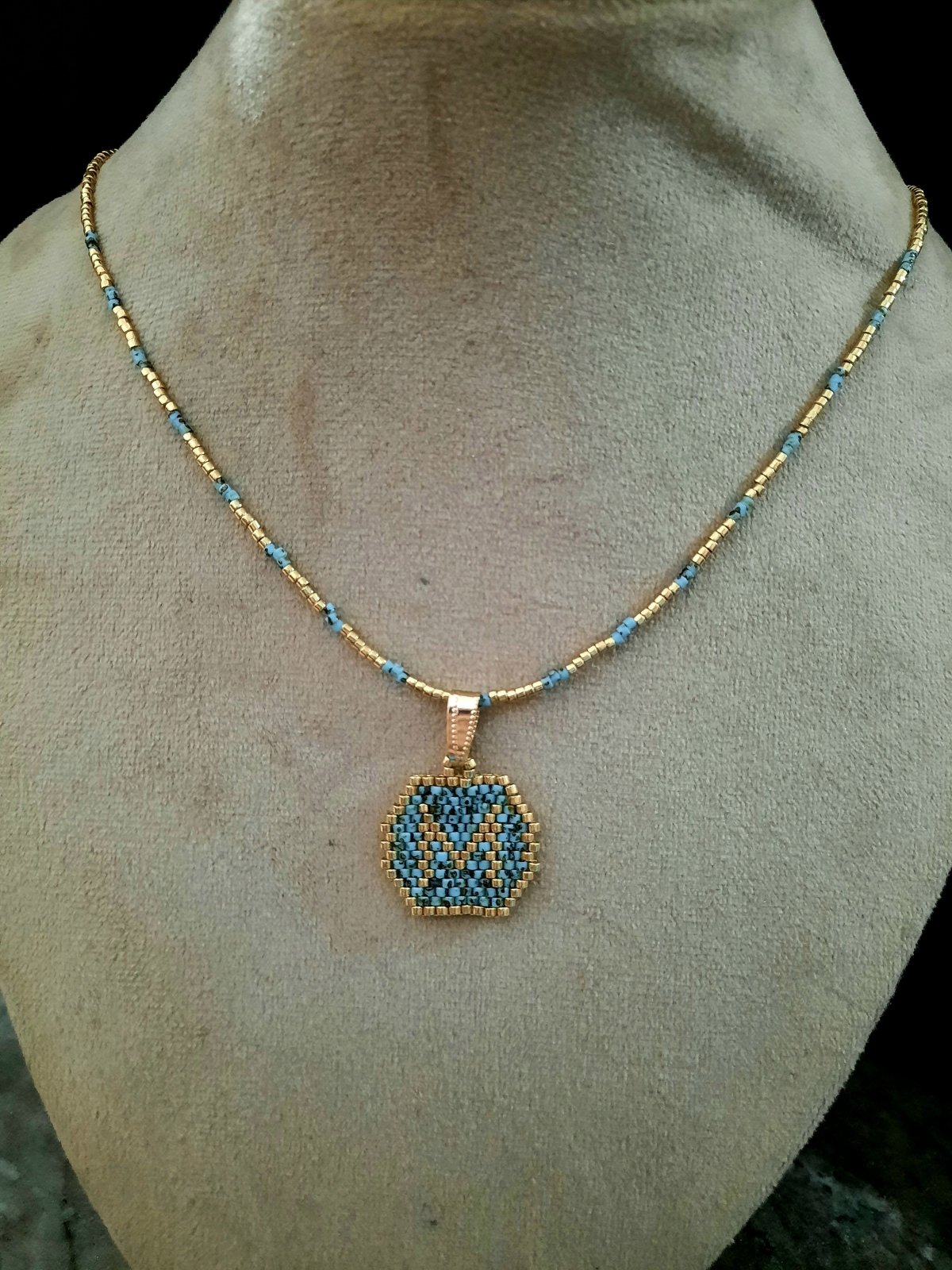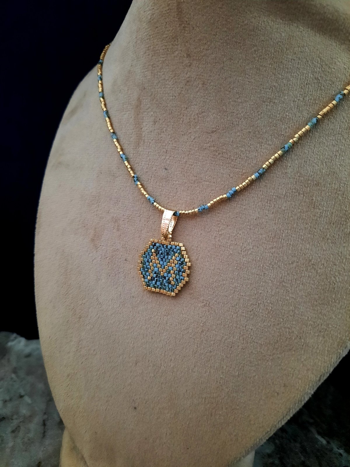 The chain is 50 cm long and there is an extension part made entirely of Miyuki beads (chain and pendant) with an overlapping of turquoise and gold. (All letters available) Any metal materials used do not rust or change color and do not cause allergies. The weight of the chain is very light