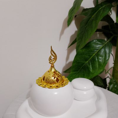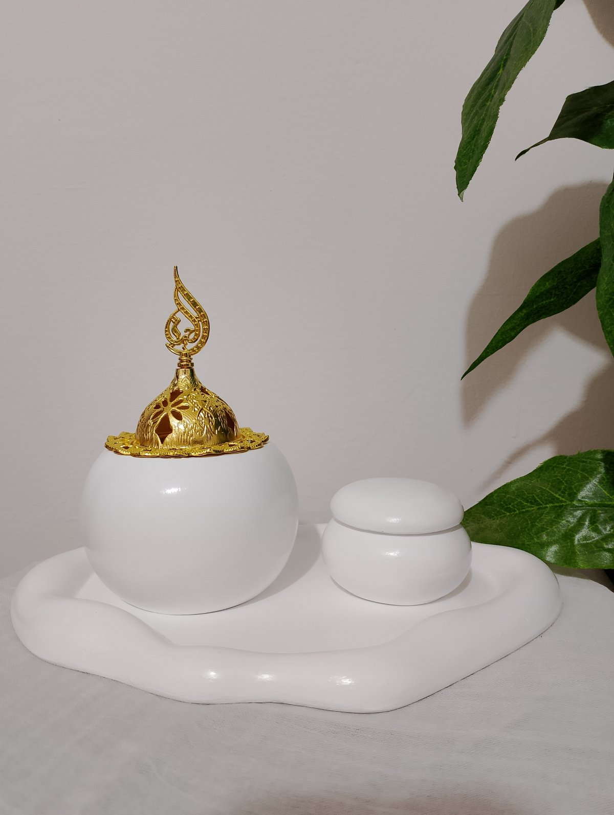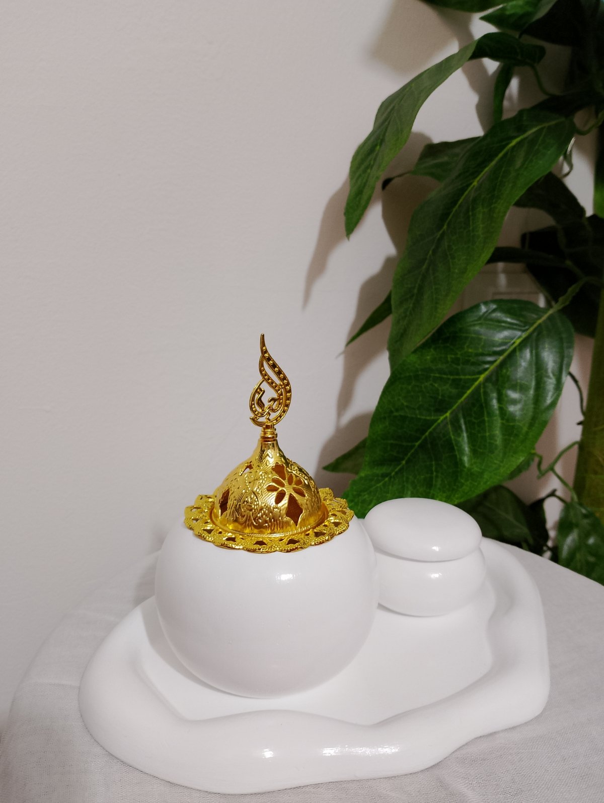A modern white decorative set consisting of an incense burner with a golden feather cover + an incense box with a white cover