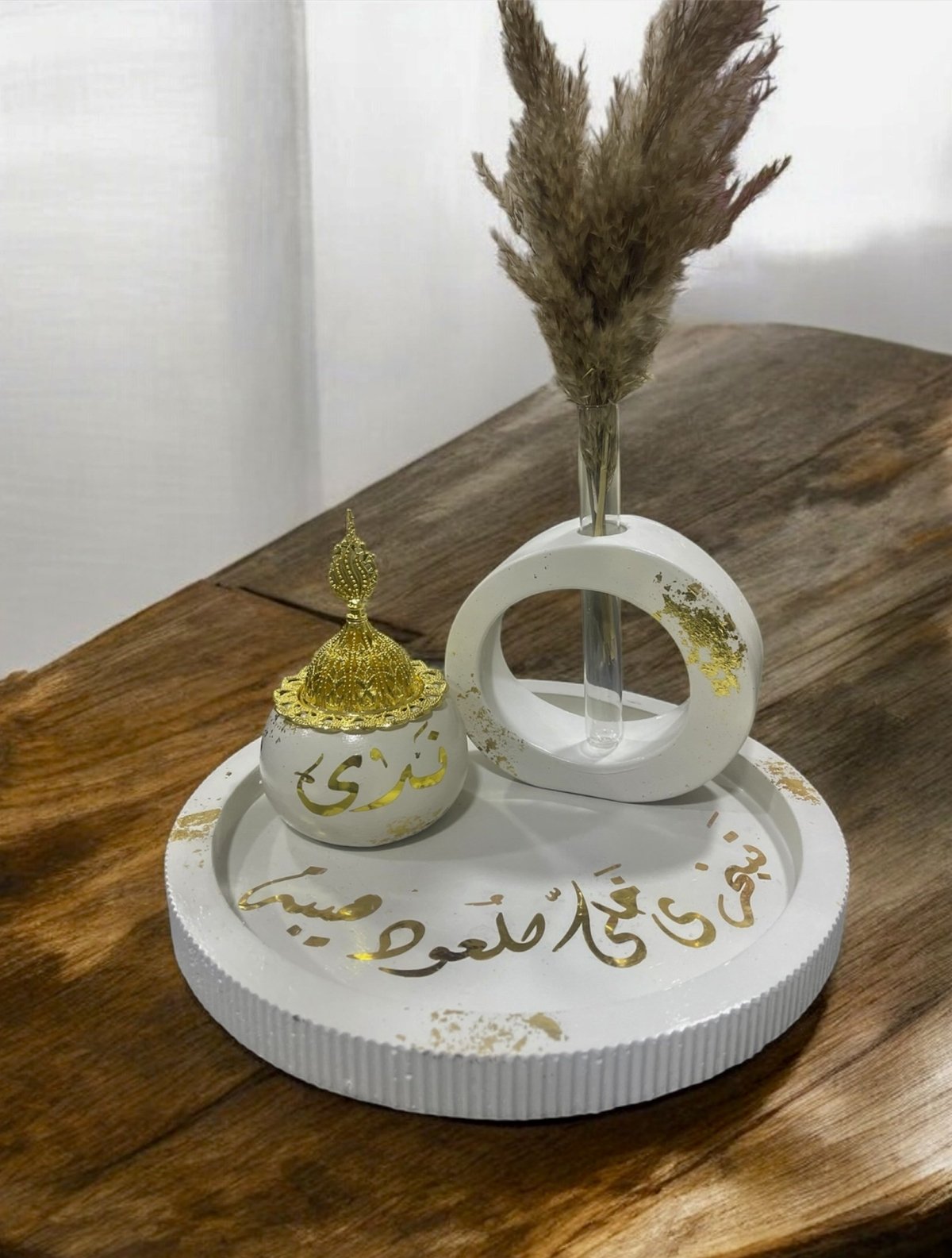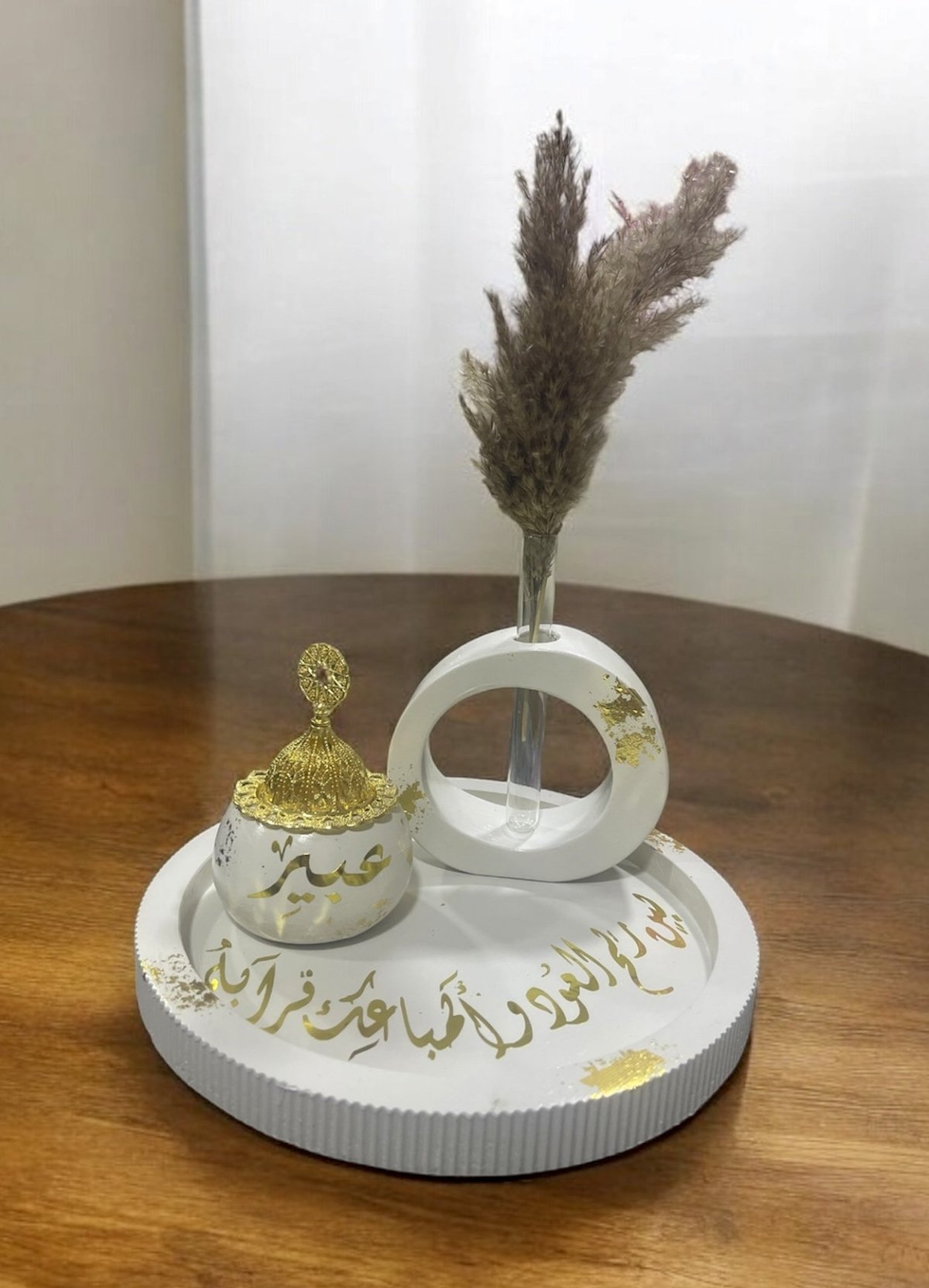 A decorative set consisting of a decorated tray, a vase, and an incense burner with a golden cover.
