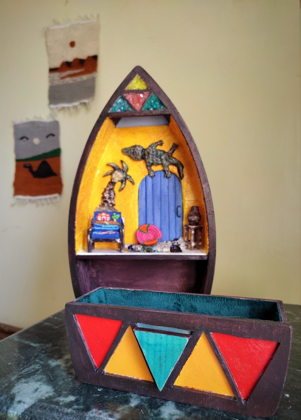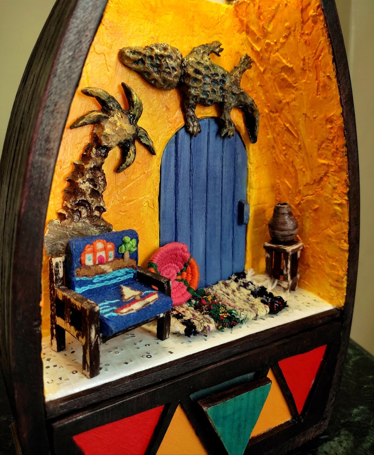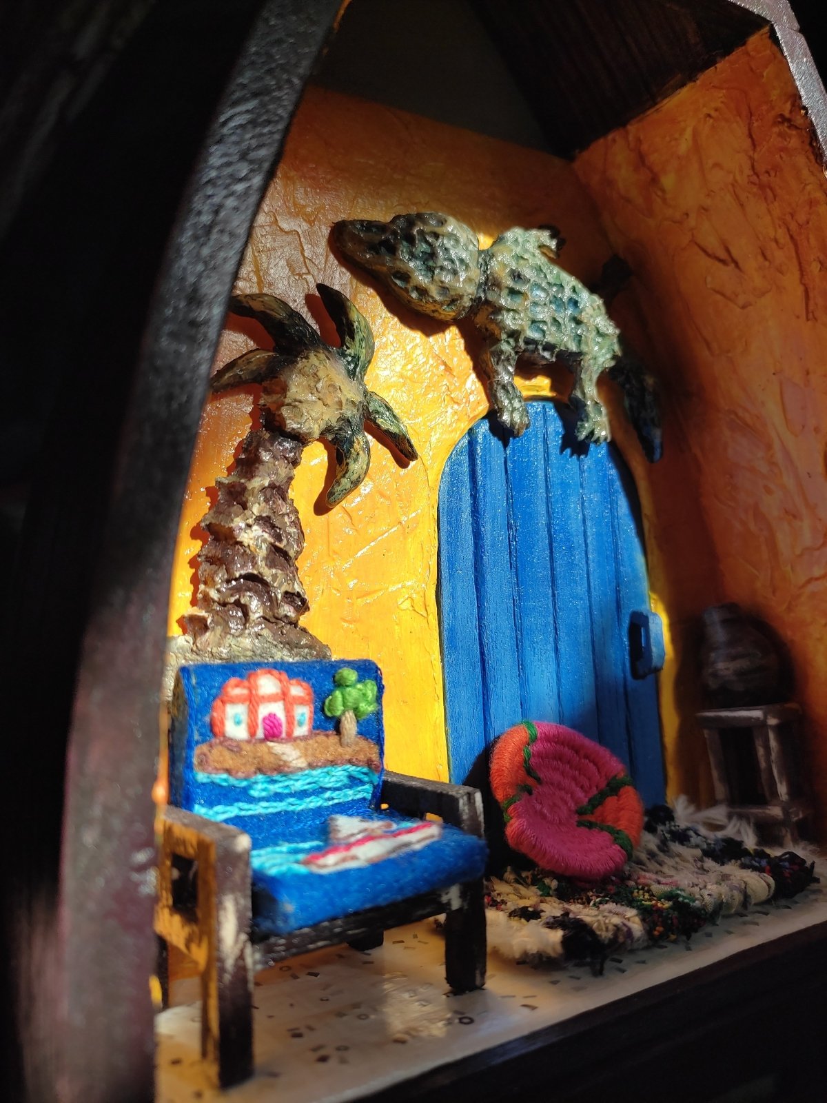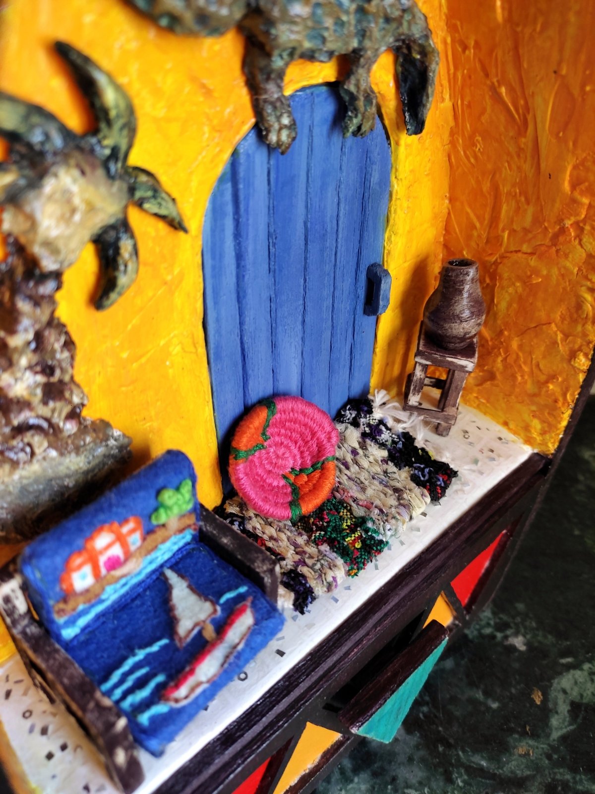 The floor, the pottery, the crocodile and the palm tree are made of ceramic paste