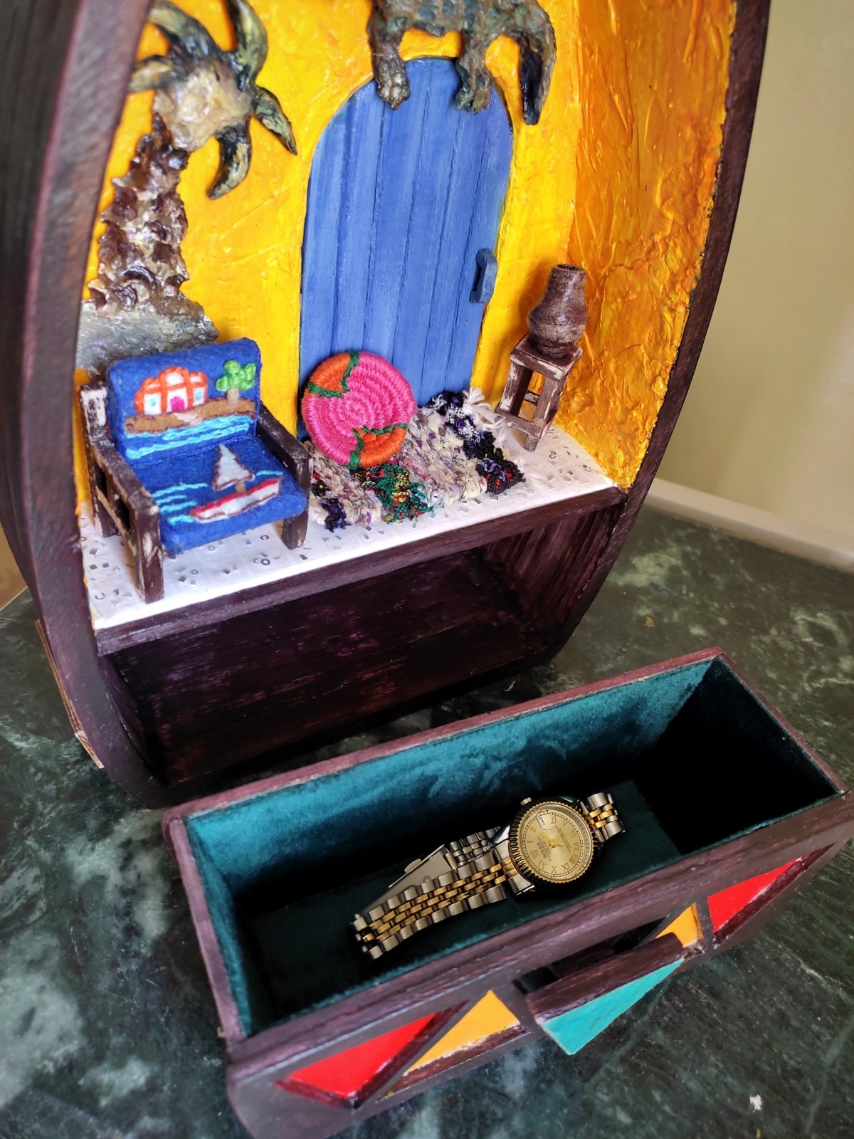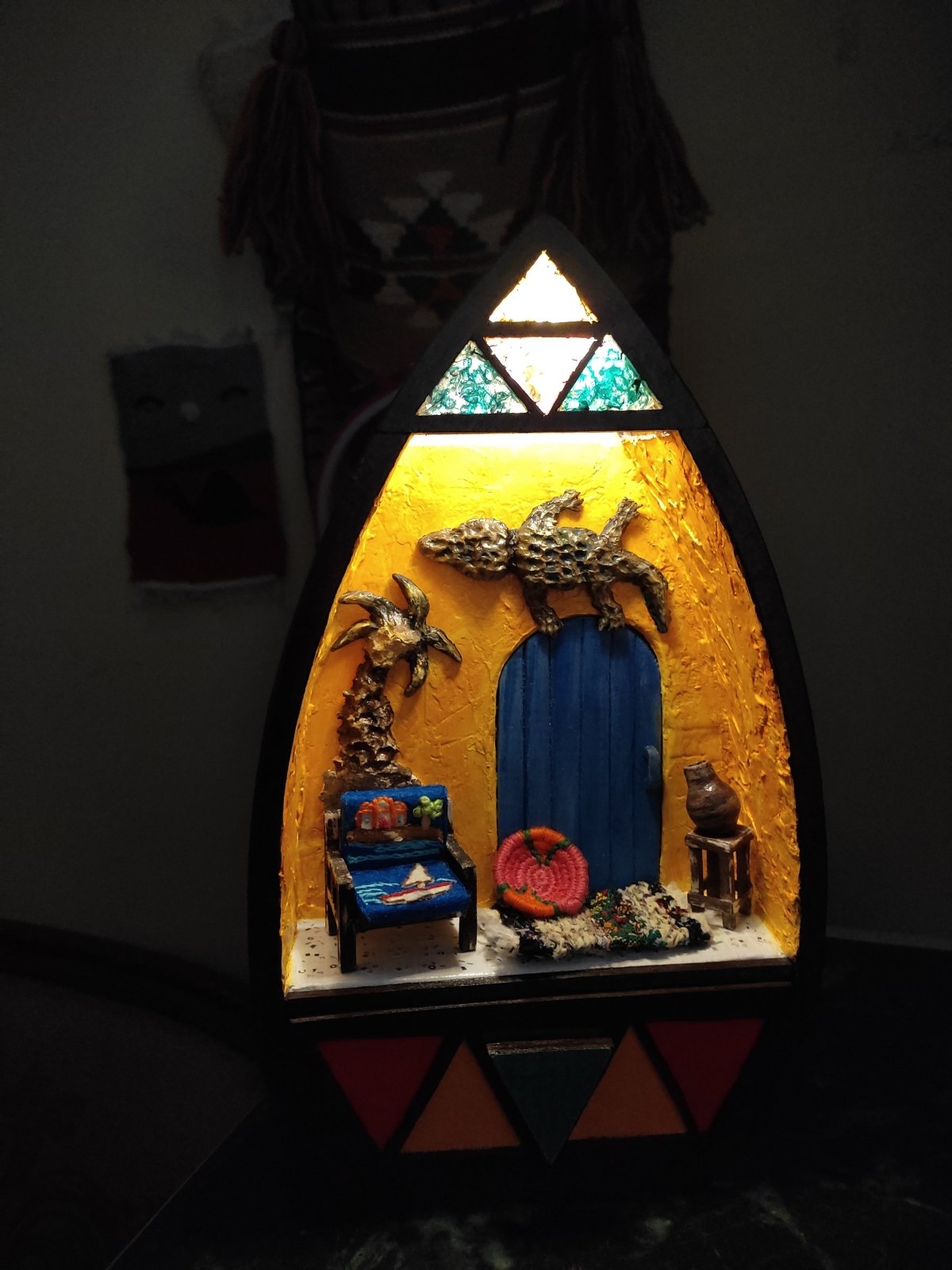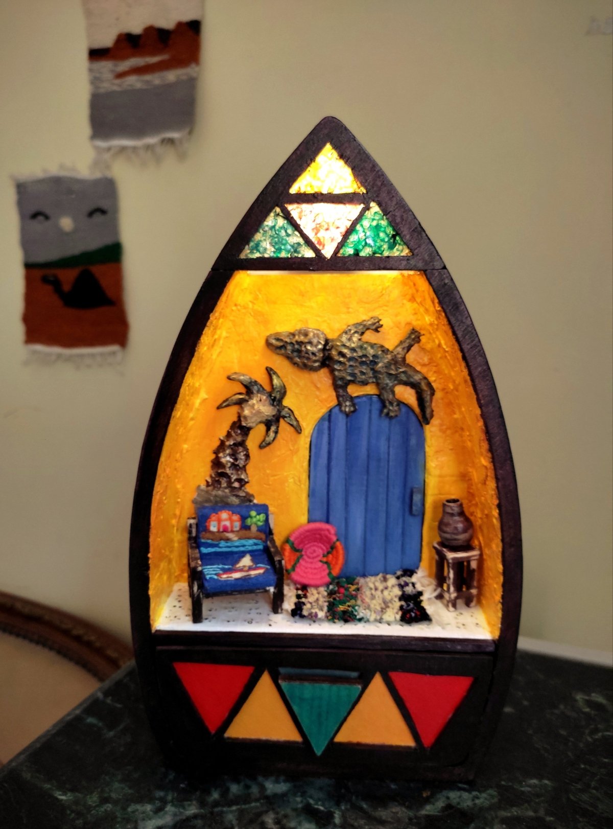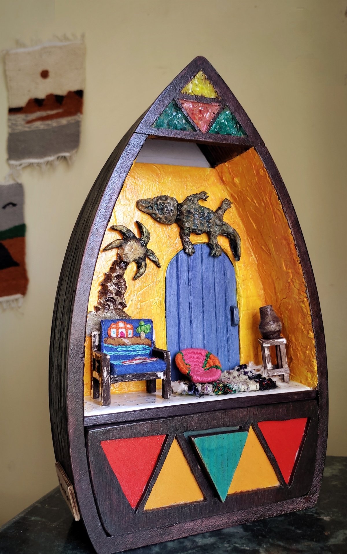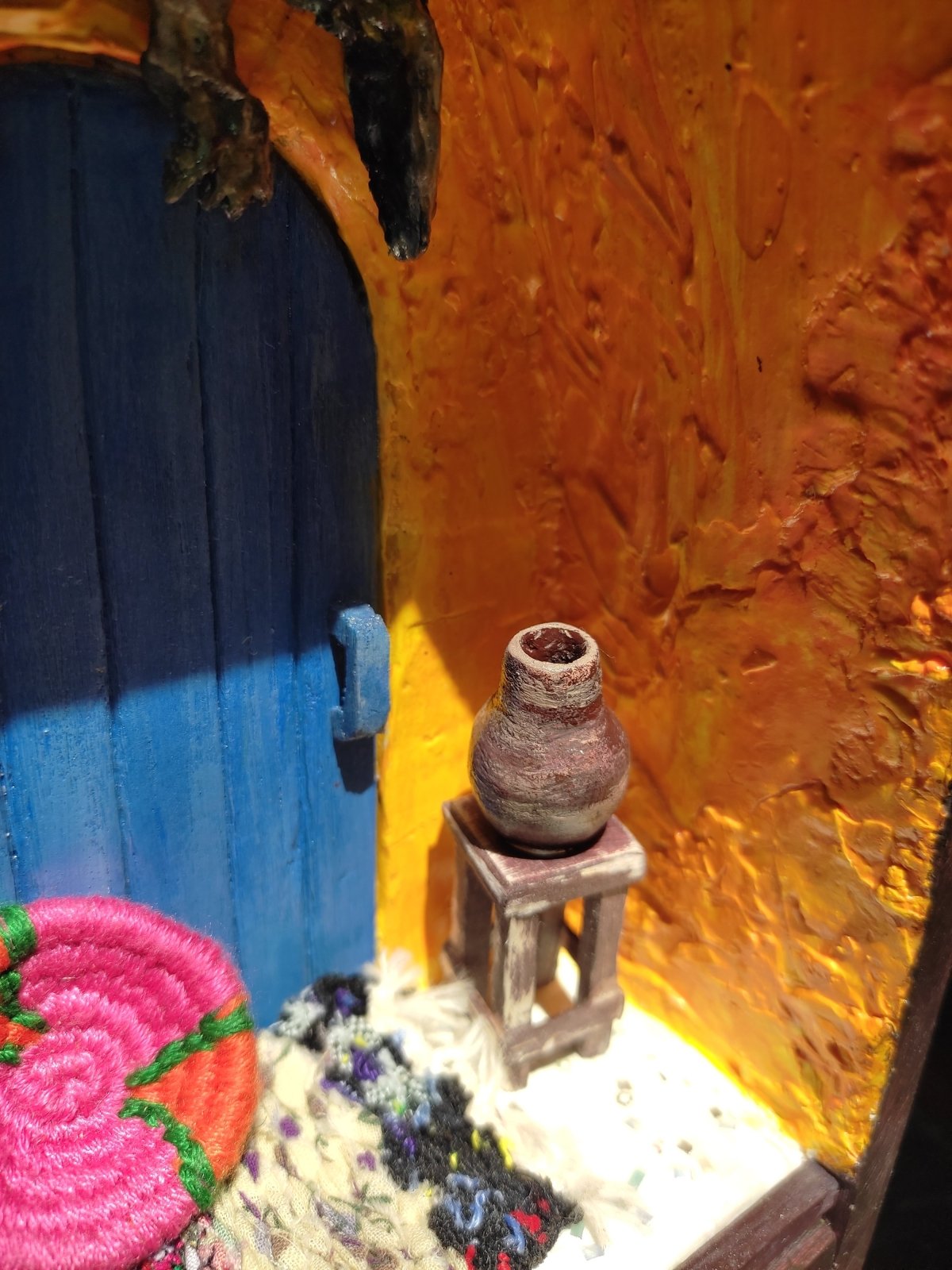 The floor, the pottery, the crocodile and the palm tree are made of ceramic paste