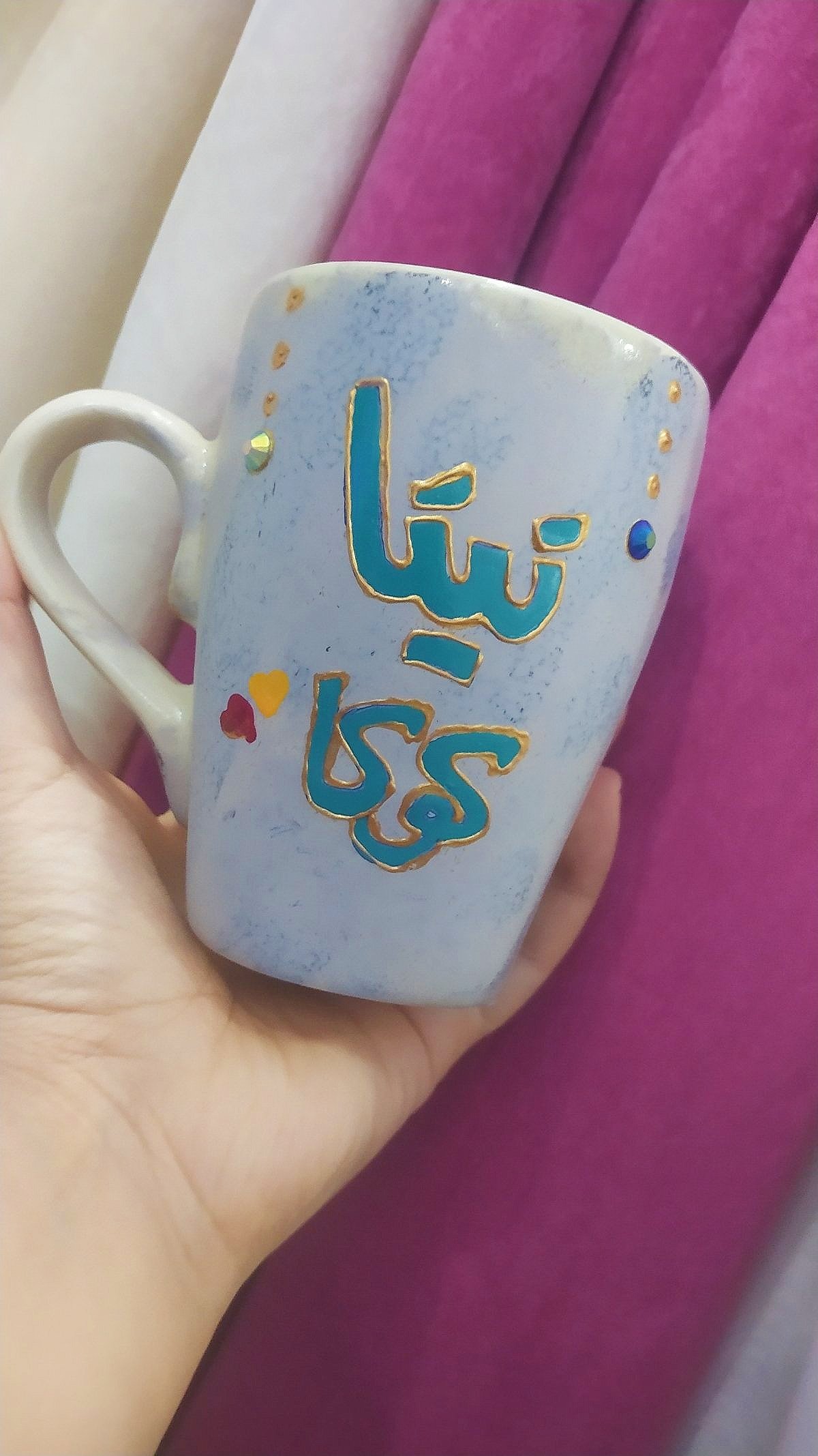 A special mug made with the name, hand-drawn in porcelain colors, specially made for this purpose, safe to eat and drink, stable, washed with soap and water using a soft medium 🎨