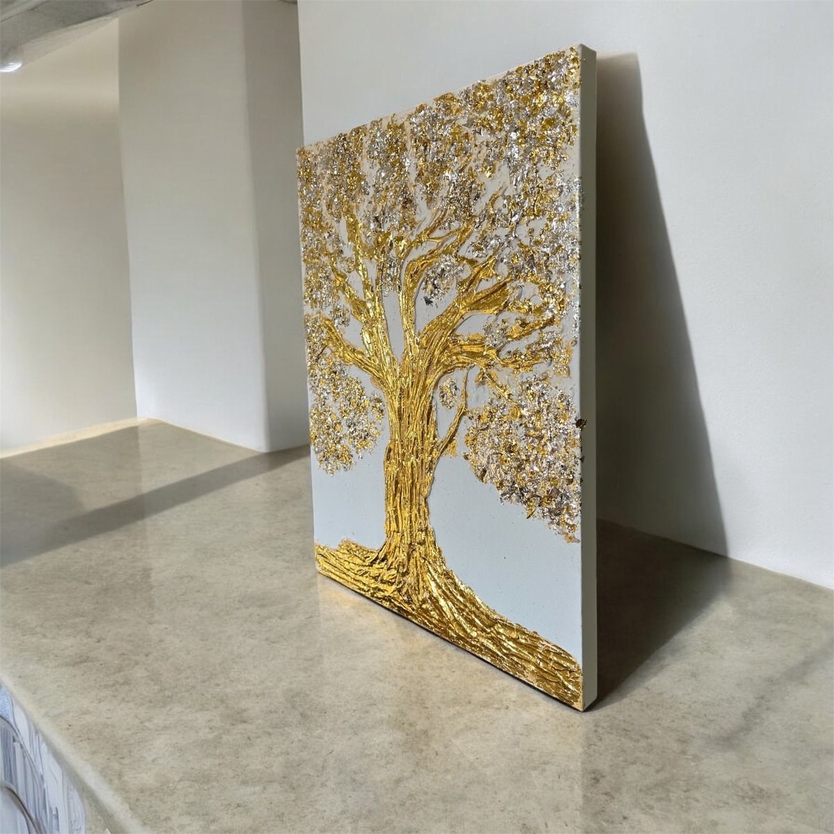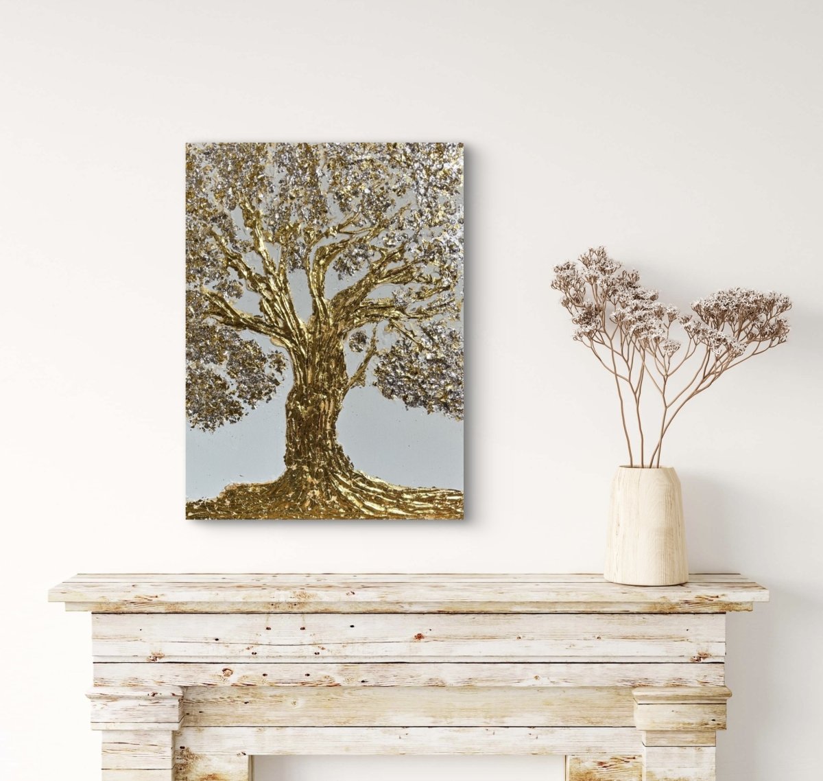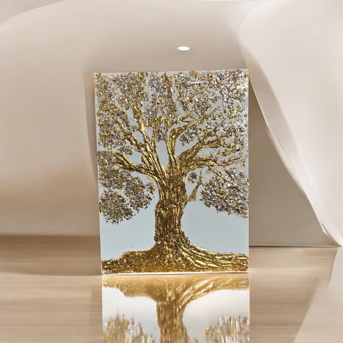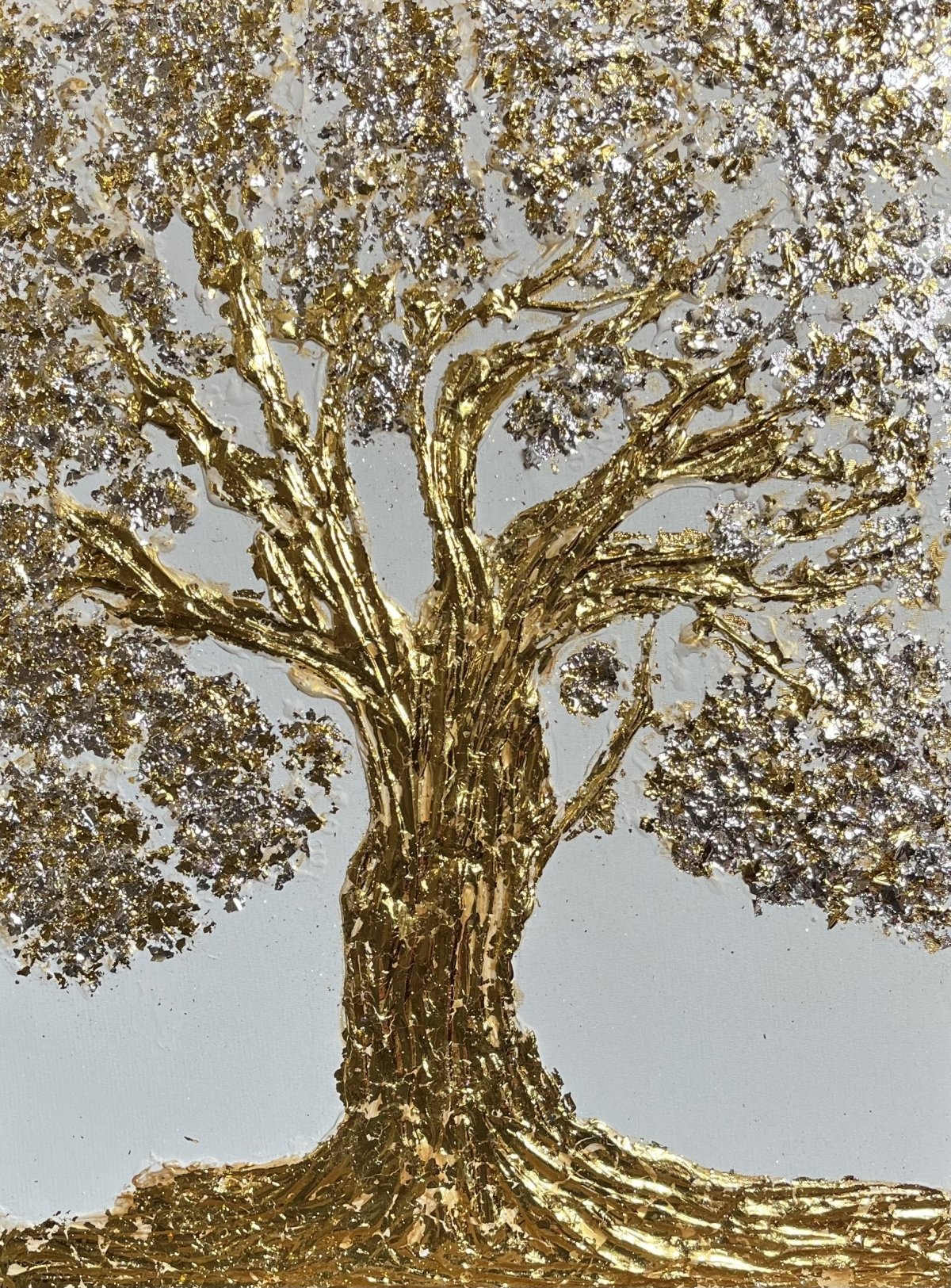 An exquisite celebration of nature's elegance, "Tree of Life" captures the essence of vitality through its masterful use of texture paste, embellished with shimmering gold and silver leaf. The artwork features a majestic tree, its intricately detailed trunk and branches ascending toward the heavens, each leaf adorned with a luminous sheen that radiates a sense beauty. Set against a soft, neutral background, the luxurious tones contrast strikingly with the sleek modernity of the canvas, creating a harmonious interplay between organic form and contemporary design. This piece embodies sophistication and reverence for life, inviting viewers to connect with its profound symbolism.