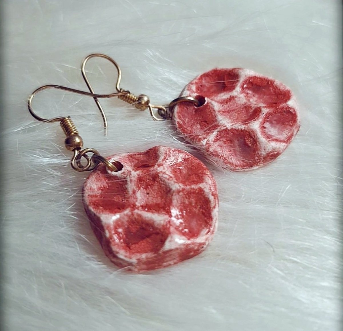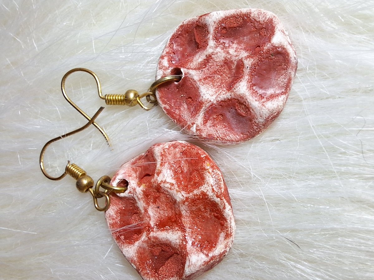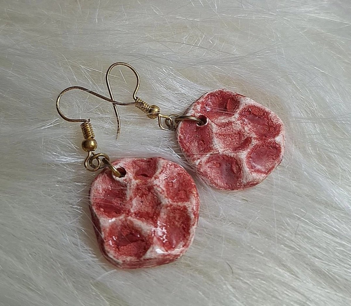 Earrings made of red porcelain and copper with a transparent glass coating. Length 4 cm. Diameter of the porcelain piece 2.5 cm