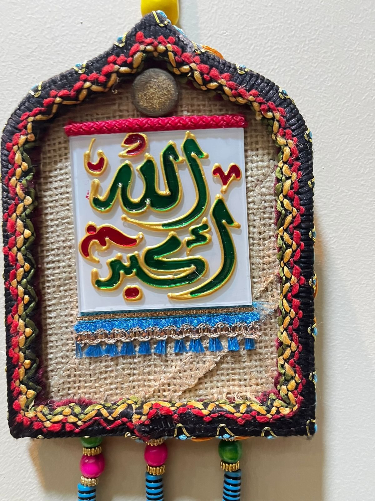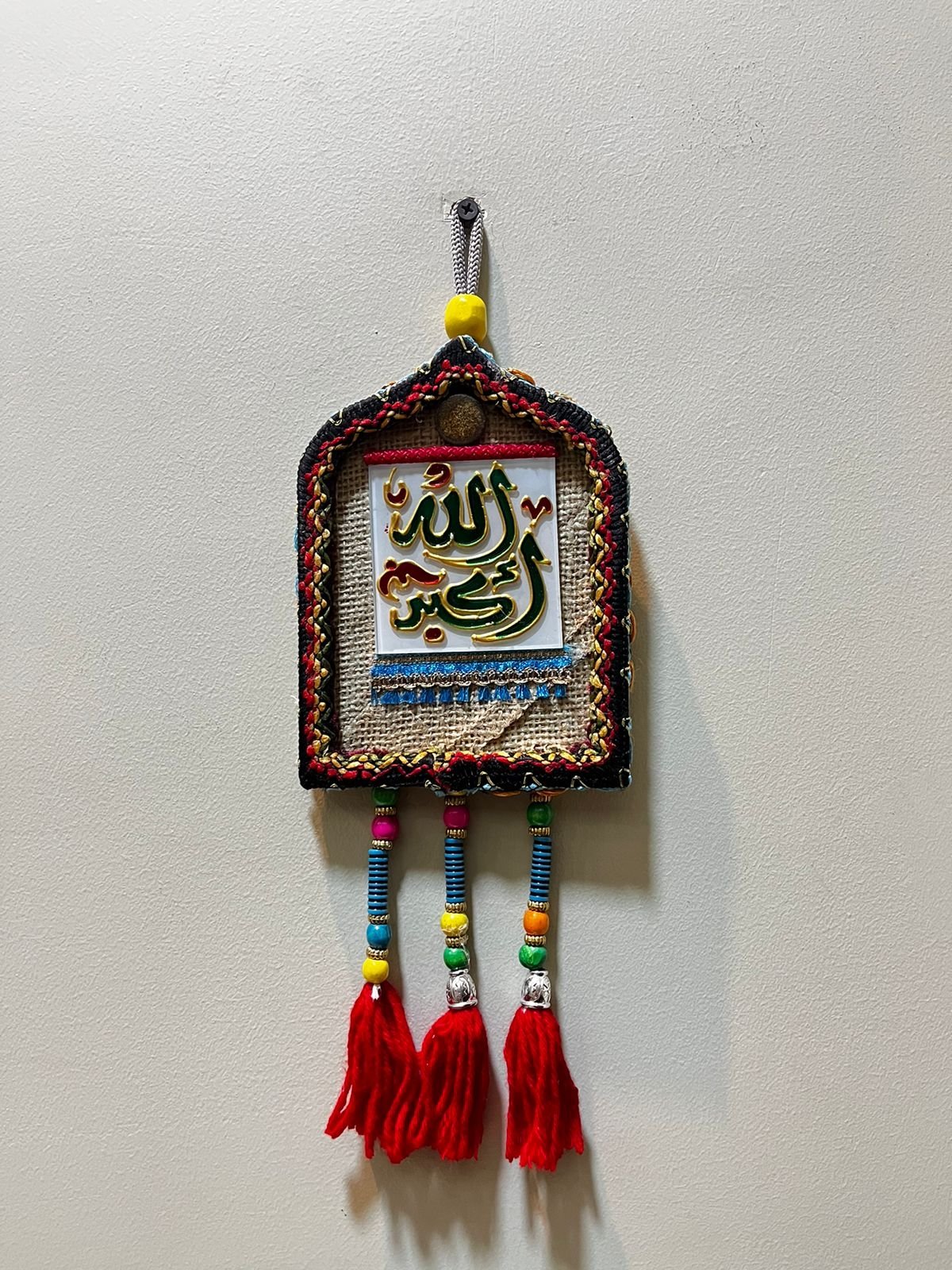 traditional decorative pendant to welcome visitors, written on it Allah akbar with glass colors, made from wood, acrylic and burlap size 12x36