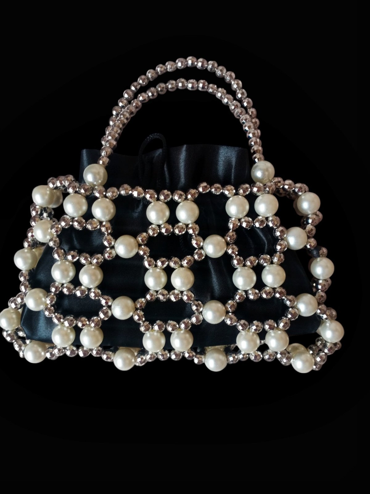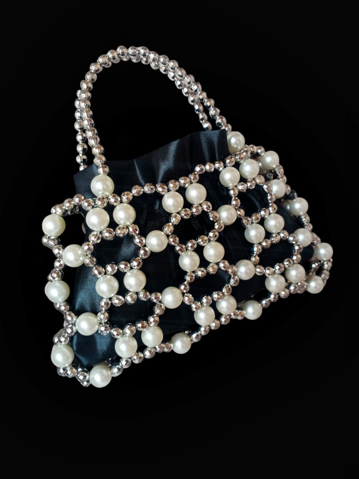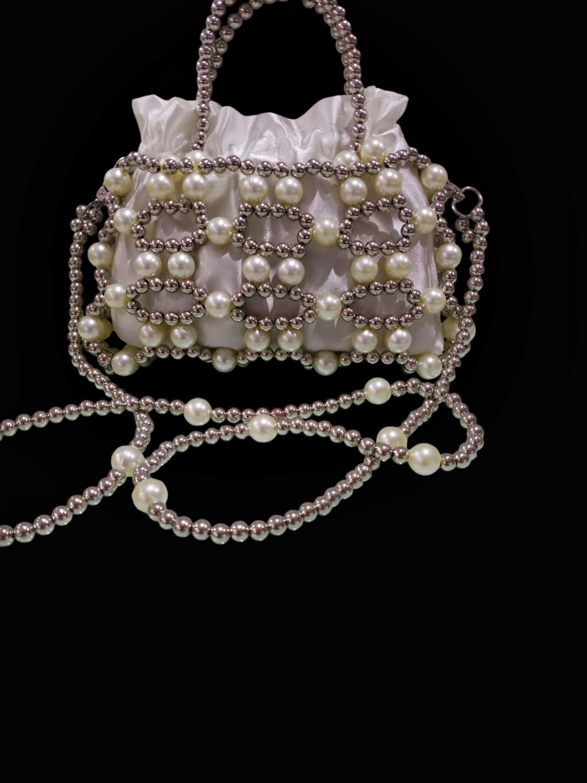A bracelet bag made of white and silver pearls, with a small handle and a crossbody strap, with an inner lining of satin, size 20*13