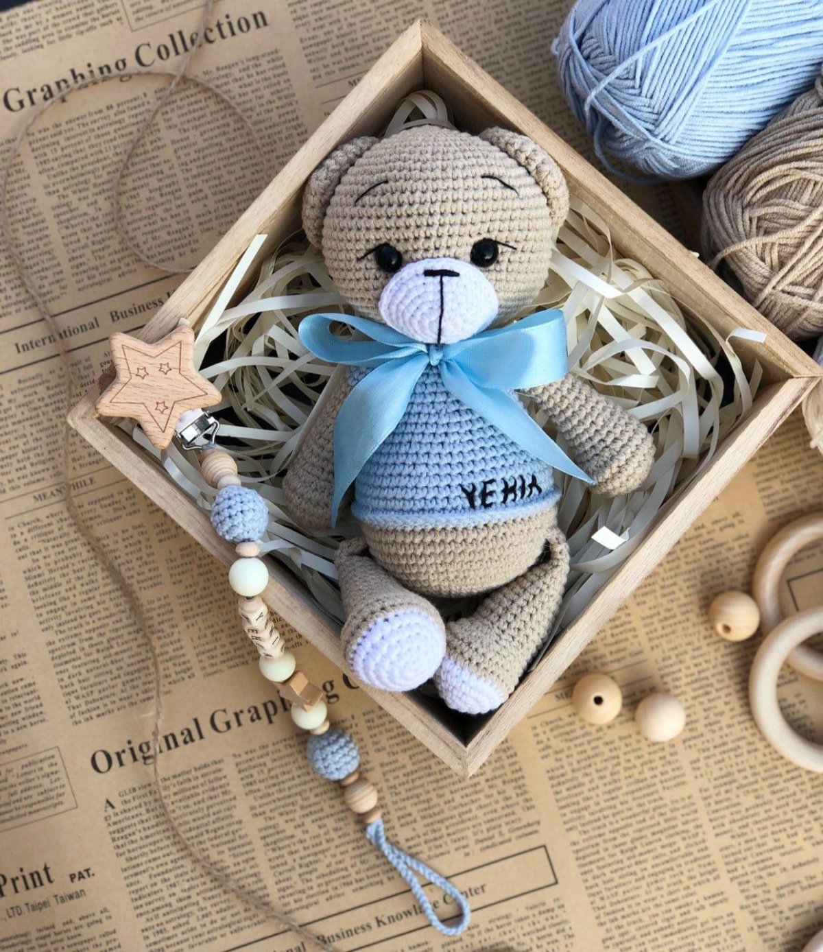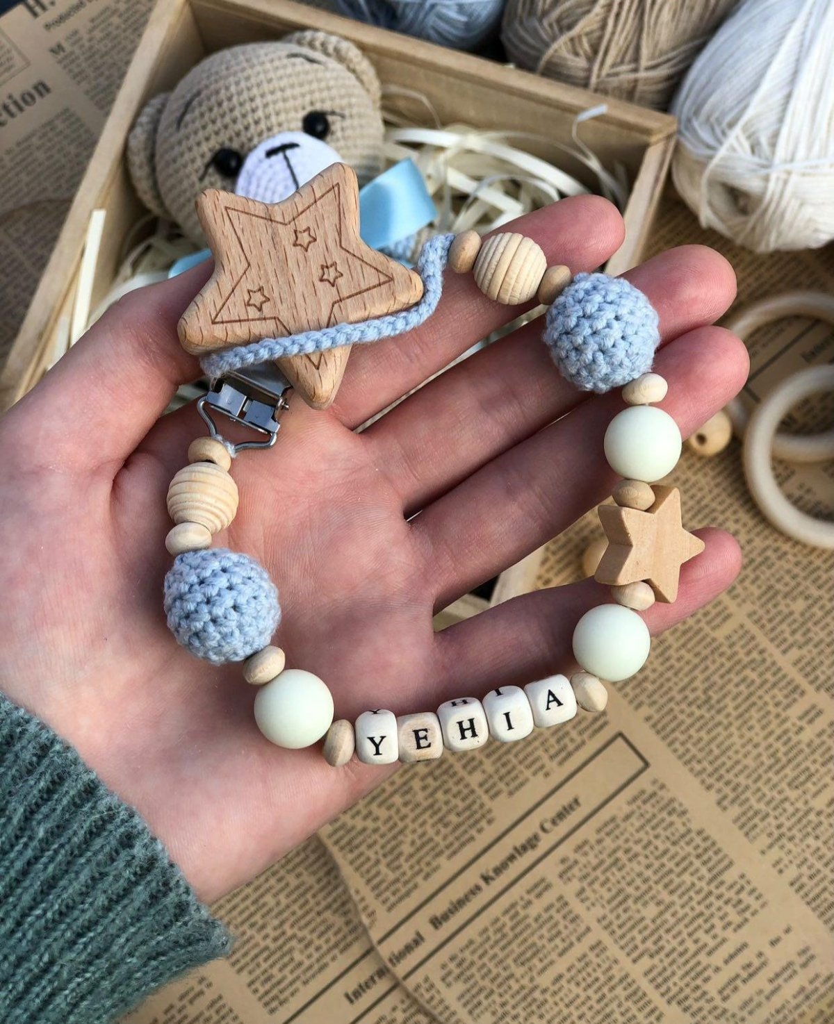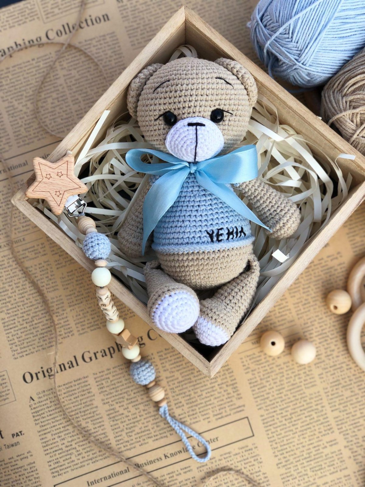 "Baby Set: A handmade bear crafted from soft Alize Cotton Gold yarn, measuring 25 cm, perfect for cuddling and play. It comes with a pacifier clip made from baby-safe wood, and you can personalize it with the baby's name. This set is the perfect gift and a lovely keepsake, completely safe for babies."