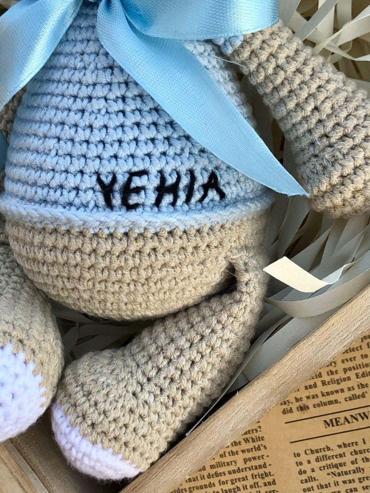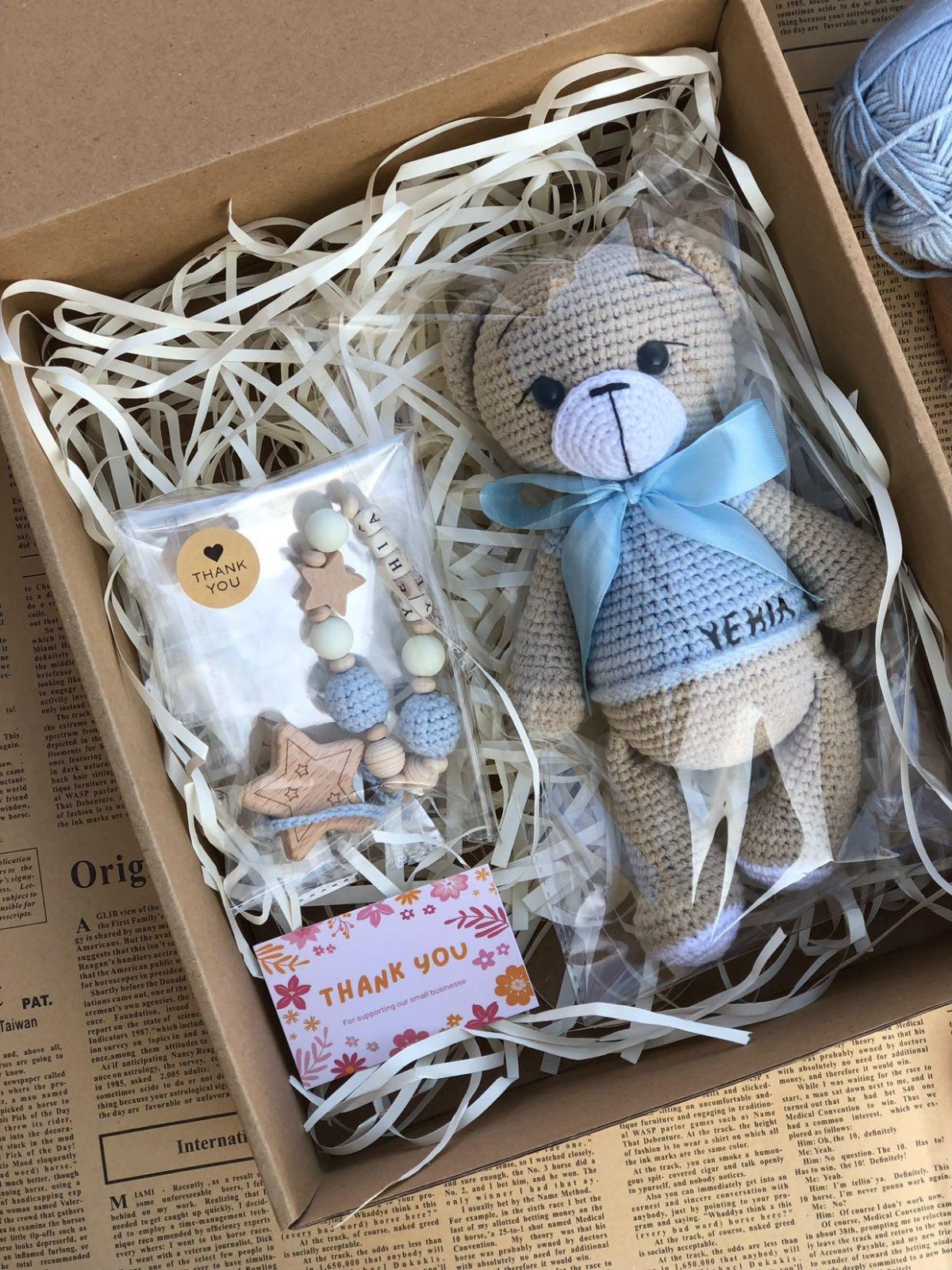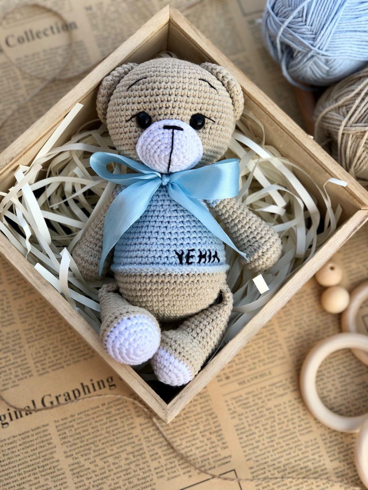 "Baby Set: A handmade bear crafted from soft Alize Cotton Gold yarn, measuring 25 cm, perfect for cuddling and play. It comes with a pacifier clip made from baby-safe wood, and you can personalize it with the baby's name. This set is the perfect gift and a lovely keepsake, completely safe for babies."